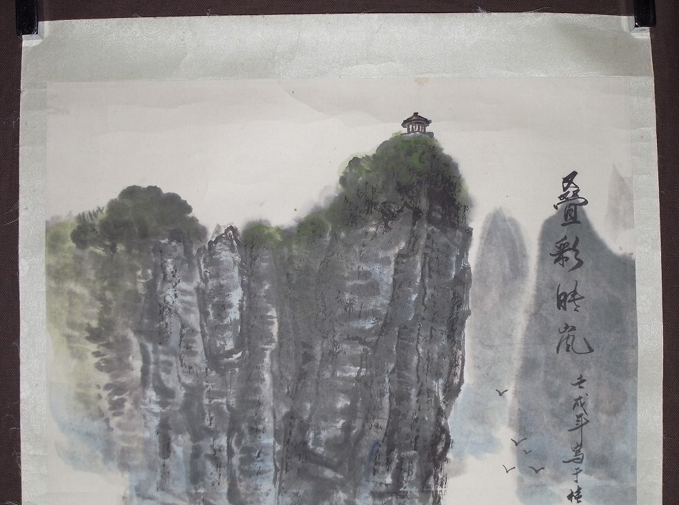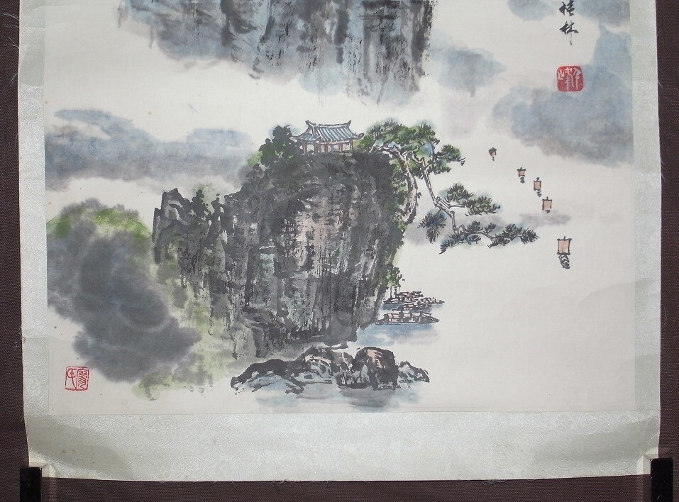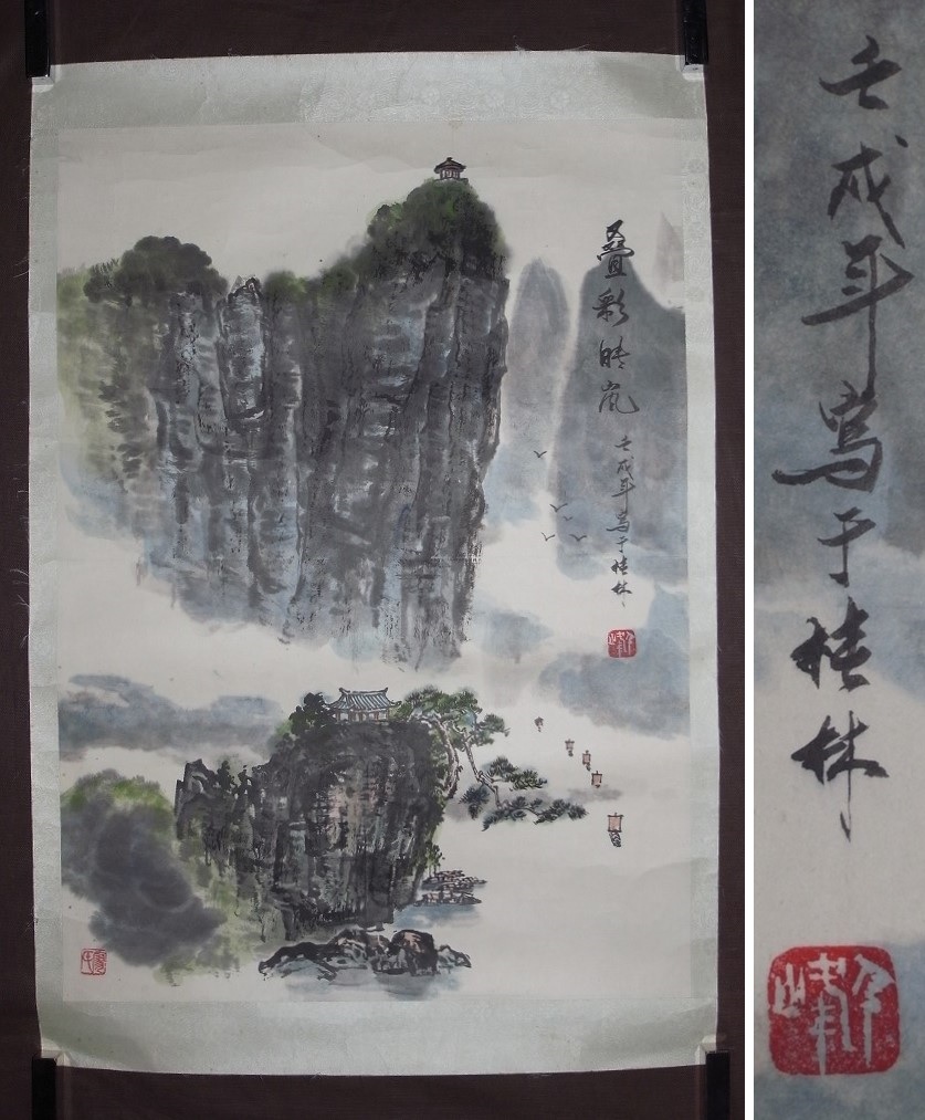 ◇出品物紹介千峰 寥氏『畳彩映嵐・桂林山水図』マクリ〔紙本肉筆真作〕でございます。