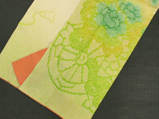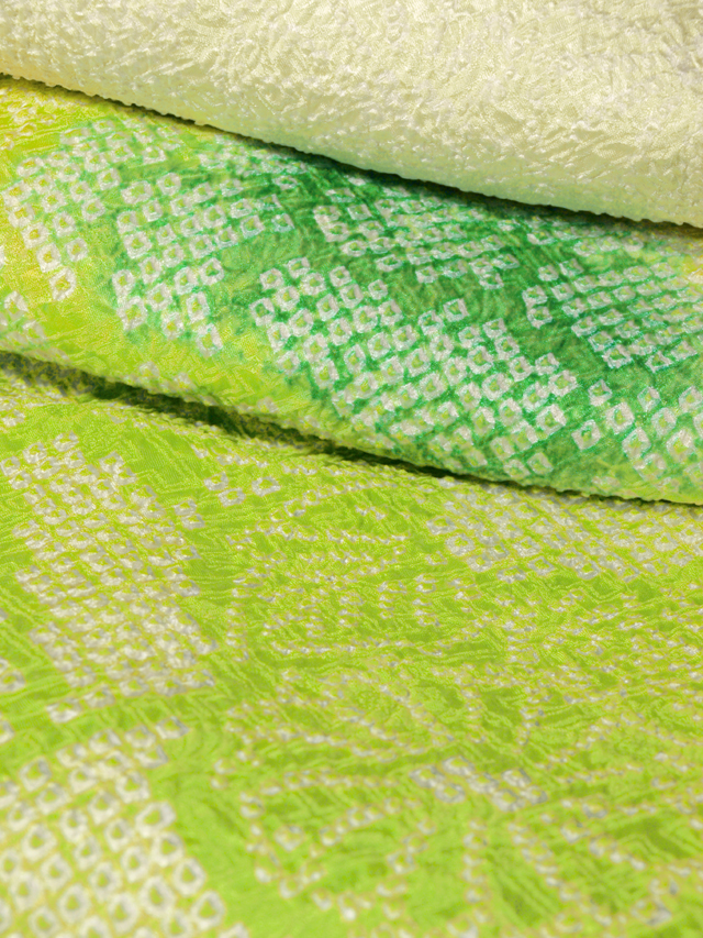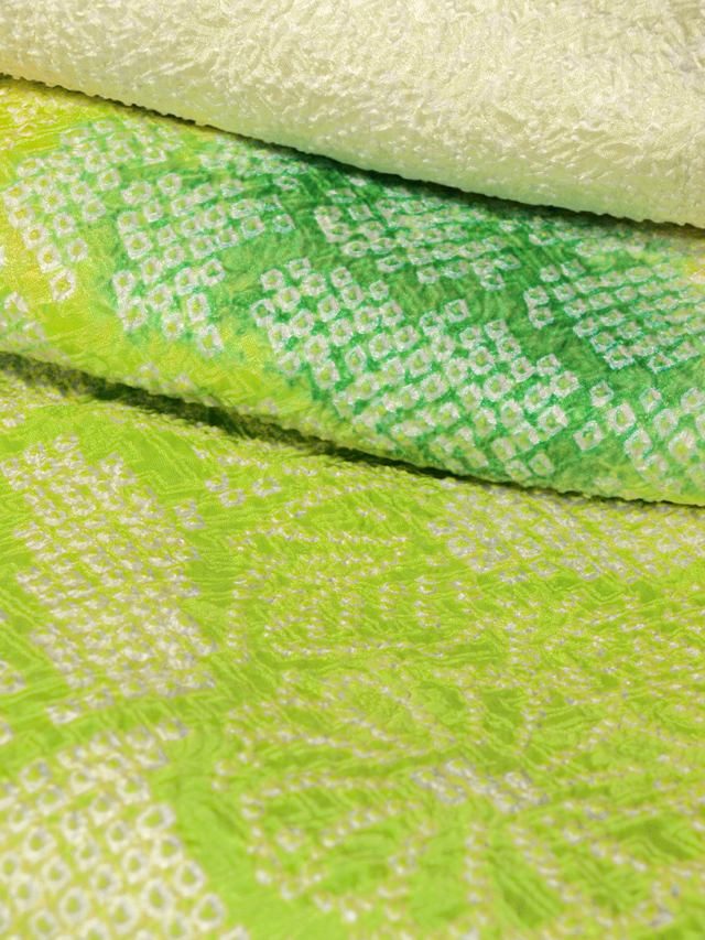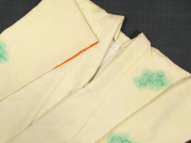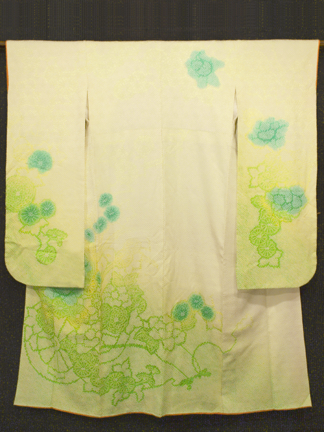 濃淡のある淡い若芽色の地に、本紋(紗綾形に花)の地紋が織り出され、絞り染めで源氏車と牡丹(ぼたん)や菊などの草花の文様が施されている綸子の総絞りの振袖です。袷仕立てです。 ろまんの香りを醸した意匠がさわやかなお色目であらわされています。しっかりと絞りの粒立ち感があります。 ユーズド品ですが、あまり使用感は感じられません。画像のとおり、上前身ごろの裾へり上に直径約 1cm の薄めの黄変が 1 か所ありますが、ほとんど判別はつかず、そのほかに目につく大きなしみやよごれ、褪色などのダメージはなく、全体的にはきれいな状態です。 |