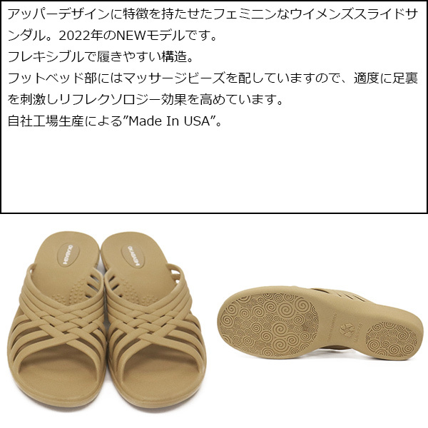 | スペック | アッパーデザインに特徴を持たせたフェミニンなウイメンズスライドサンダル。 |