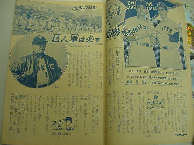 昭和36年(1961)に刊行されたオリジナル雑誌『少年サンデー』7号、1冊です。当時の巨人軍のキャンプ情報の他、手塚治虫や寺田ヒロオ、わちさんぺいや石森章太郎などレジェンド漫画入り少年雑誌です。経年のイタミはありますのでご容赦願います。今から64年前の人気マンガ雑誌をお見逃しなく!