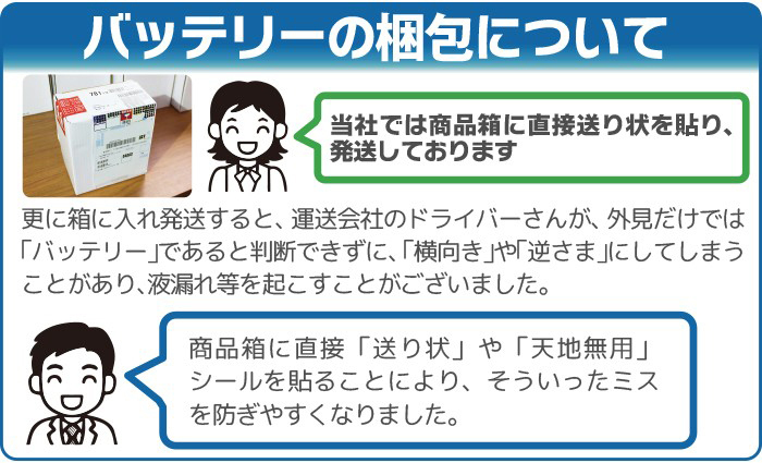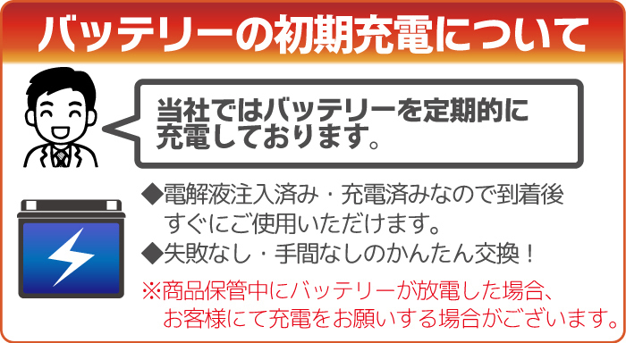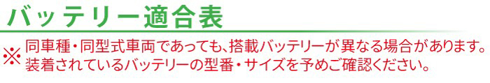| ※同車種・同型式車両であっても、搭載バッテリーが異なる場合があります。 装着されているバッテリーの型番・サイズをあらかじめご確認ください。 また、車種によっては端子の位置や形状が異なりバッテリーに加工が必要な可能性があります。 |