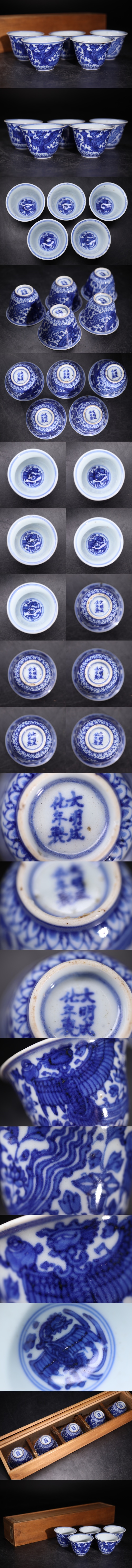 | 大明成化年製 底款 染付 鳳凰図 煎茶碗 五客 木箱付 / 明 成化 中国美術 茶器 煎茶道具 .G2566 |