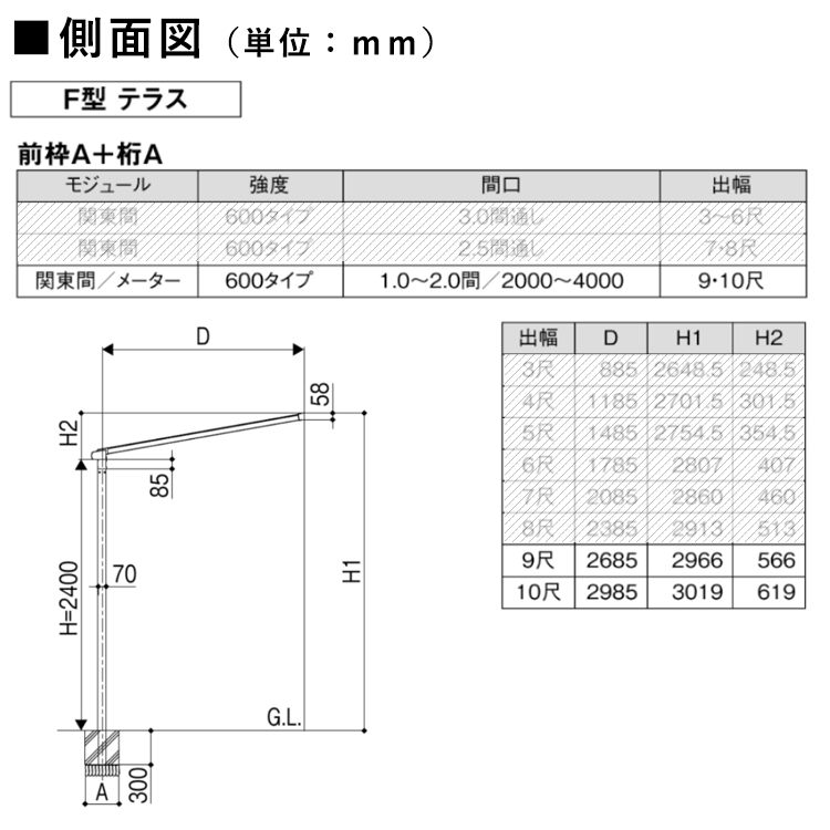 標準柱(地面からの高さ):H=2,400mm▽ カラー