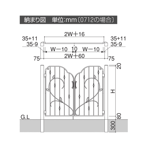 | 仕様・サイズ | 全幅181cm(扉80cm×2)X高さ120cm ▼通常仕様 ・扉の開閉方向:内開き(家側へ開く)仕様 ・打掛け錠 (外/内:簡易錠) | |
