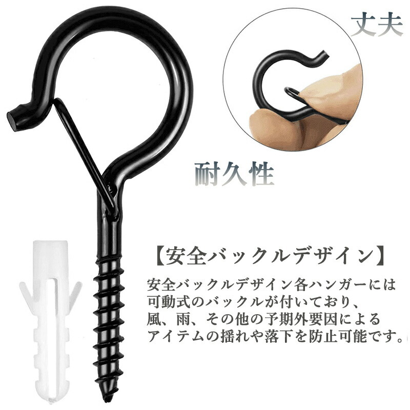 安全バックルデザイン各ハンガーには可動式のバックルが付いており、風、雨、その他の予期外要因によるアイテムの揺れや落下を防止可能です。普通のネジフックより丈夫、耐久性があります