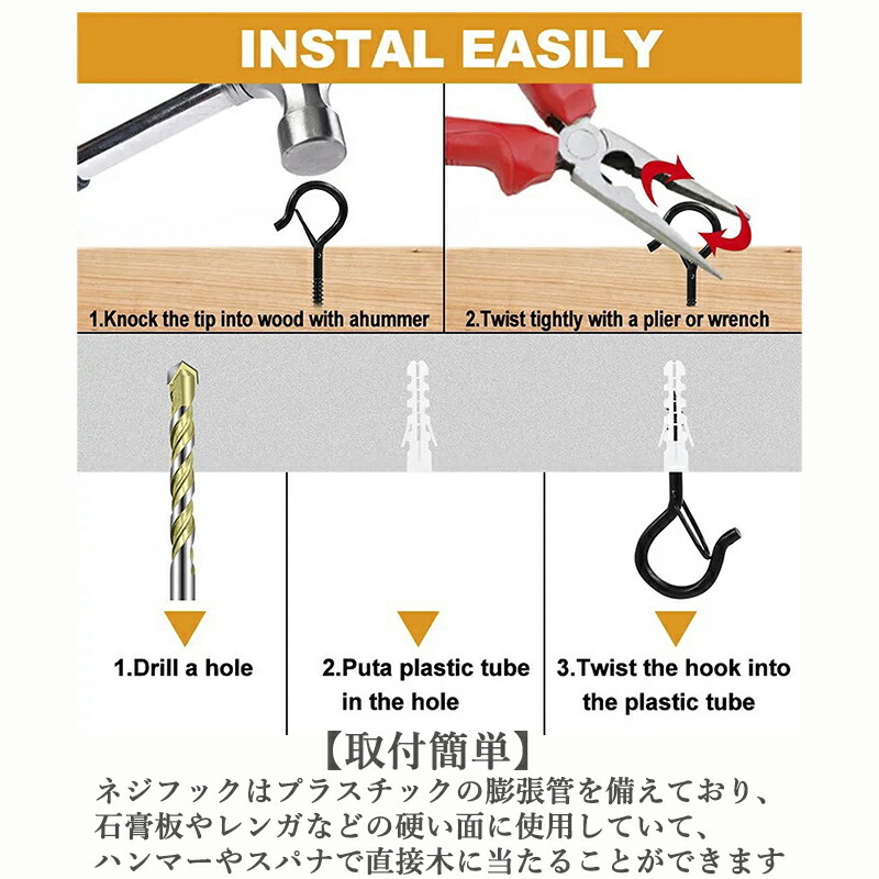 ネジフックはプラスチックの膨張管を備えており、石膏板やレンガなどの硬い面に使用していて、ハンマーやスパナで直接木に当たることができます