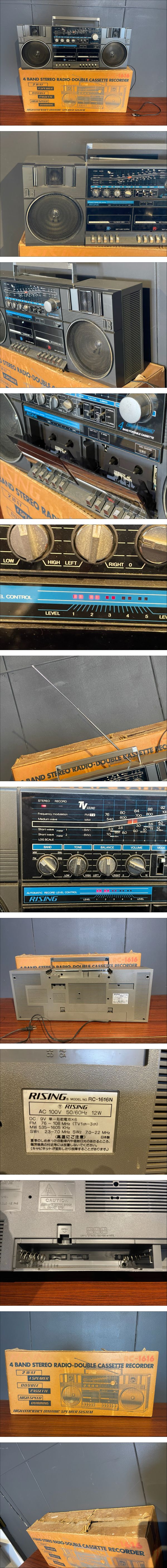 | 商品説明 | 動作品★ 当時物★ 大型ダブルラジカセ★ RISING RC-1616N 箱付き 昭和レトロ ジャンク扱い 買取品です。 A,Bデッキとも再生しましたが、伸びた音がします。 A,Bデッキとも巻き戻しOK。早送りX ラジオOK 良い音します。 電池ボックス綺麗です。 箱付きですがボロボロなのでおまけ程度でお考えください。 古いものですので現状にて部品取りや修理前提でお願いいたします。 |