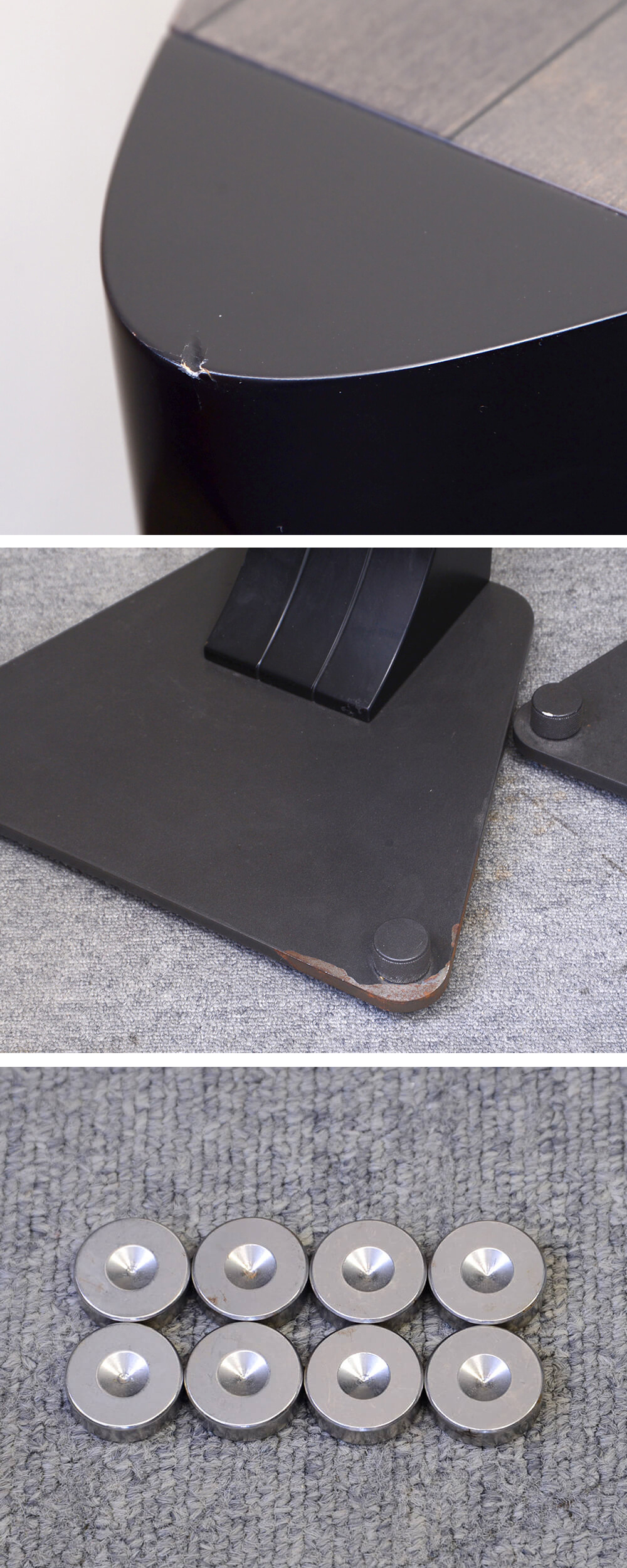 ネットは出品前に正規代理店ノア様で張替を実施しておりゴムの伸びなどありません。 片側スピーカーの天板の後ろ側に目立つ傷あります。スタンドにも傷や凹み、塗装の剥がれている箇所あります。 よく見るとツイターにシワありますが、ほとんど目立たない程度と思います。 |