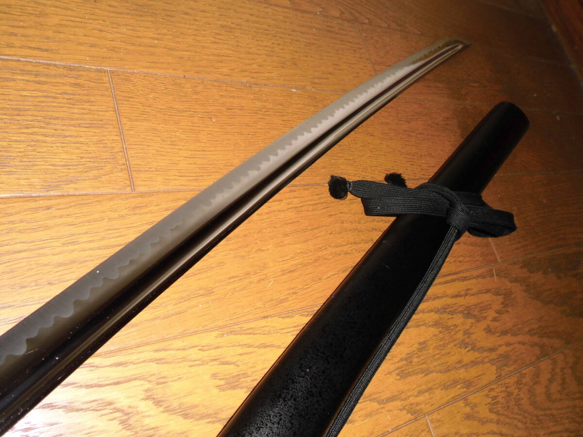 | ご覧のような、本格高級居合刀(真剣)では、ありません)です。 『備前長船写し』(模造刀) 刀身・2尺2寸 元幅31mm 元重6.5mm 鞘払い860g 全長 100.5cm 柄長 24.5cm 本鮫皮 木製 黒純綿巻き 刃長 66.3cm 刃文 丁子乱れ(留樋) 硬質合金製 鞘長 75.5cm 木製 黒石目塗り 縁頭 「竹笹の図」 素銅地風 古美仕上げ 目貫 「笹蟹の図」 赤銅風 鍔 「無地・刀匠」 鉄地 片櫃 (時代鍔) ハバキ 真鍮地錆上げ 祐乗風 下緒 黒人絹角朝 手落ちもバランスも、とても良く取れています。 拵えも良い金具などが、使われています。 中古品です。 全体的に充分綺麗な状態かとは思いますが、多少の使用感はあります。 横手も綺麗に取れていて、帽子も出ています。 柄に僅かな手持ちの使用感は、あります。 刀身や鞘に、僅かな擦れやアタリ・汚れなどは有ります。 下げ緒に、所々のほつれが有ります。 全体的に古雅な感があるかと、思います。 ご使用後は、丁子油を塗っておいて下さい。 代理出品の品物です。 店頭にて売れました場合は早期終了致しますので、ご了承下さい。 ※ゆうパック着払いにて、お送り致します。 (140サイズくらいになるか、と思います) [検:刀装具/鐔/縁頭/目貫/柄/小柄/笄/刀剣/日本刀/太刀/脇差/鞘/拵え/大小/甲冑/鎧/兜/具足/骨董/武具] | ||