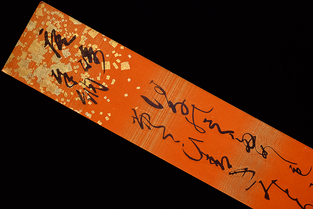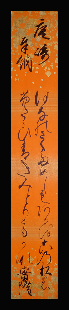 紙本(金切箔散黄丹地)肉筆未装短冊1点 作品寸法:36.1cm x 6.0cm 商品状態:良好。実際の品を画像にてお確かめ下さい。 ★本品は印刷ではなく肉筆保証の作品です。 ★本品は真作保証の作品です。 出品作品の読みにつきましては、ご落札頂いた後のご依頼についてのみ、出来るだけ対応させて頂きます。 三条西実隆(さんじょうにしさねたか) 室町後期の公卿・歌人。内大臣三条西公保の次男。初名は公世・公延、法名は尭空・逍遥院。号は耕隠・聴雪・雪。正二位内大臣に至る。宗祇より古今伝授をうけ、飛鳥井雅康に和歌を学ぶ。一条兼良と共に室町後期の文教を支えた。門人に武野紹らがいる。歌集『雪玉集』や日記『実隆公記』がある。天文6年(1537)歿、83才。 (出典:思文閣『美術人名辞典』) |