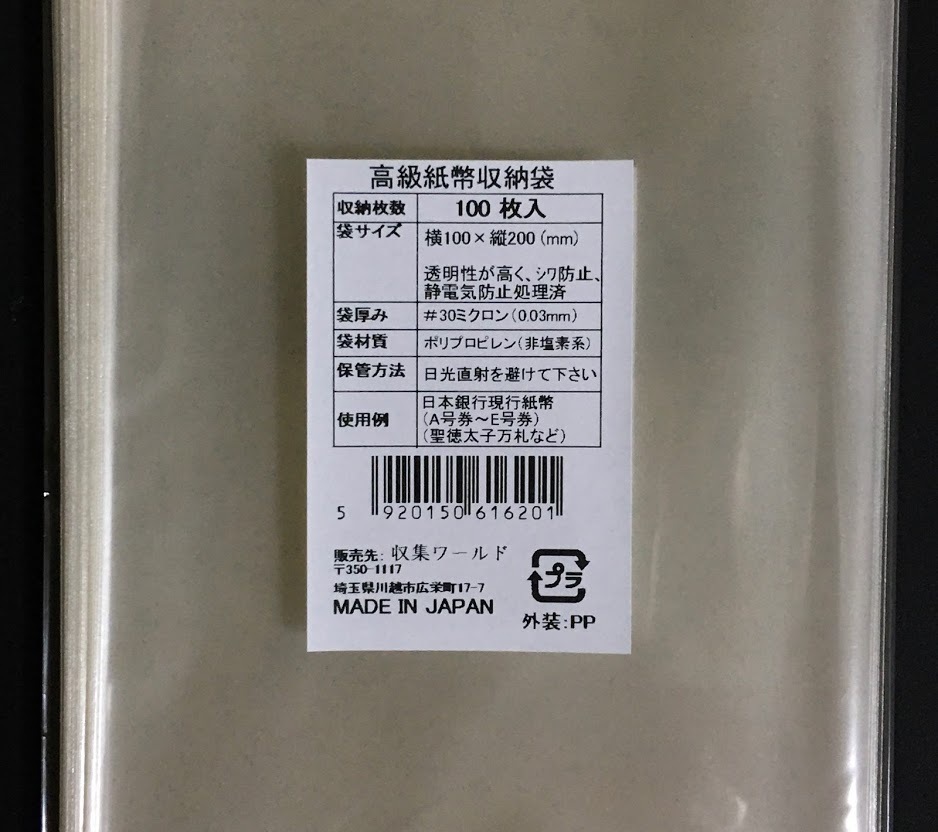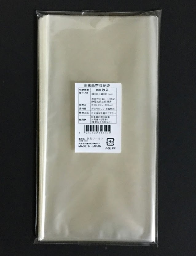 紙幣収集用 OPP袋サイズ/横100×縦200mm 厚さ30μ 日本製 100枚入「クレカ決済可」収集ワールド