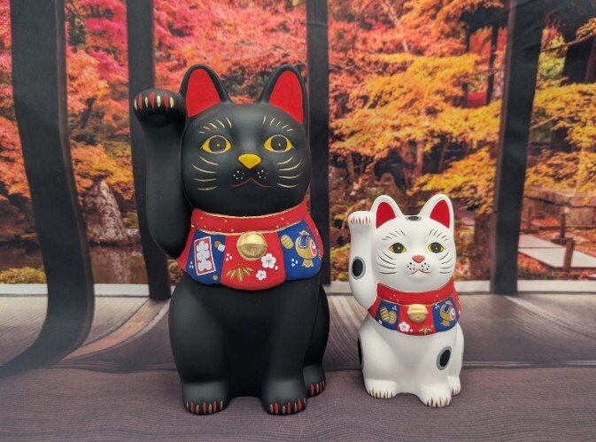 招き猫 縁起物 福づくし招き猫 右手上げ黒大、白小 2体セットです。 ※職人の手作りのため、 写真と色・かたちが若干異なることがございます。 一体一体表情などに個体差がございますので 画像はあくまでご参考程度にお考えいだきますよう よろしくお願いいたします。 【サイズ】 全長約16cm(大) 陶器 全長約10cm(小) 陶器 棚7870 7872