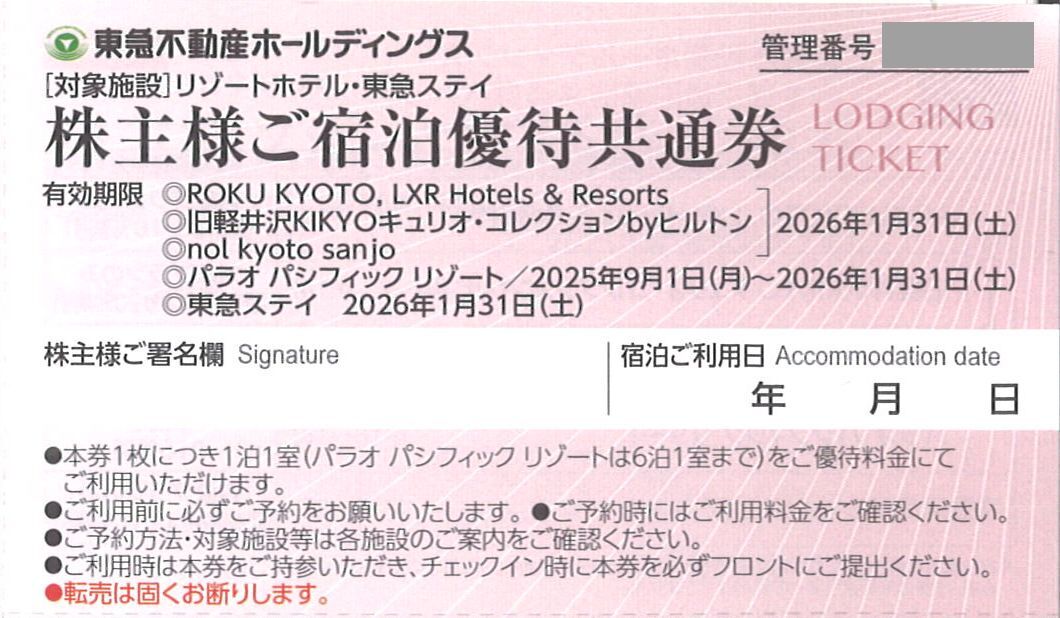 有効期限は「2026年1月31日」です。 本券1枚につき、1泊1室(パラオ パシフィック リゾートは6泊1室まで)を優待料金にてご利用頂けます。 株主様ご署名欄は利用者(代表者)様のお名前をご記入ください。 ※詳細につきましては、画像またはこちらよりご確認ください。 |