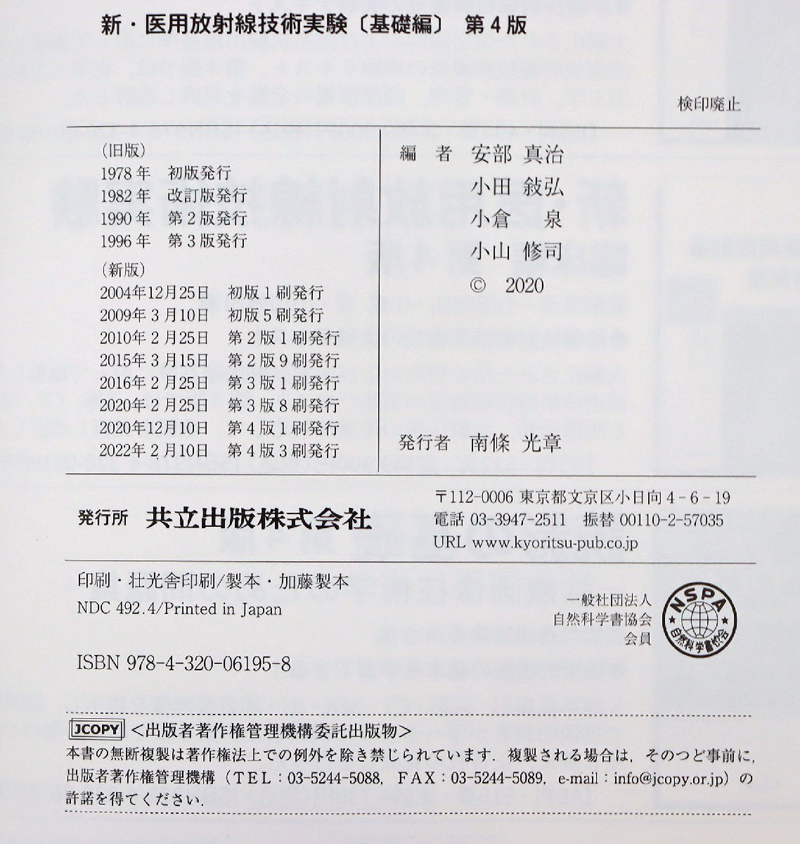 | S◎中古品◎書籍『新・医用放射線技術実験 基礎編 第4版』 編:安部真治/小田敍弘/小倉泉/小山修司 共立出版 2022年2月10日第4版3刷発行 (4084162T) ※中古品です。 書籍 『新・医用放射線技術実験 基礎編 第4版』 編:安部真治/小田敍弘/小倉泉/小山修司 共立出版 2022年2月10日第4版3刷発行 こちらから商品情報がご覧になれます ◎外観 カバーはキズやスレ、イタミがあります。 天・地・小口はキズやスレ、ヨゴレがあります。 本体はキズがあります。 ◎付属品 ・カバー ※商品写真に掲載したものが全てです。 | ||