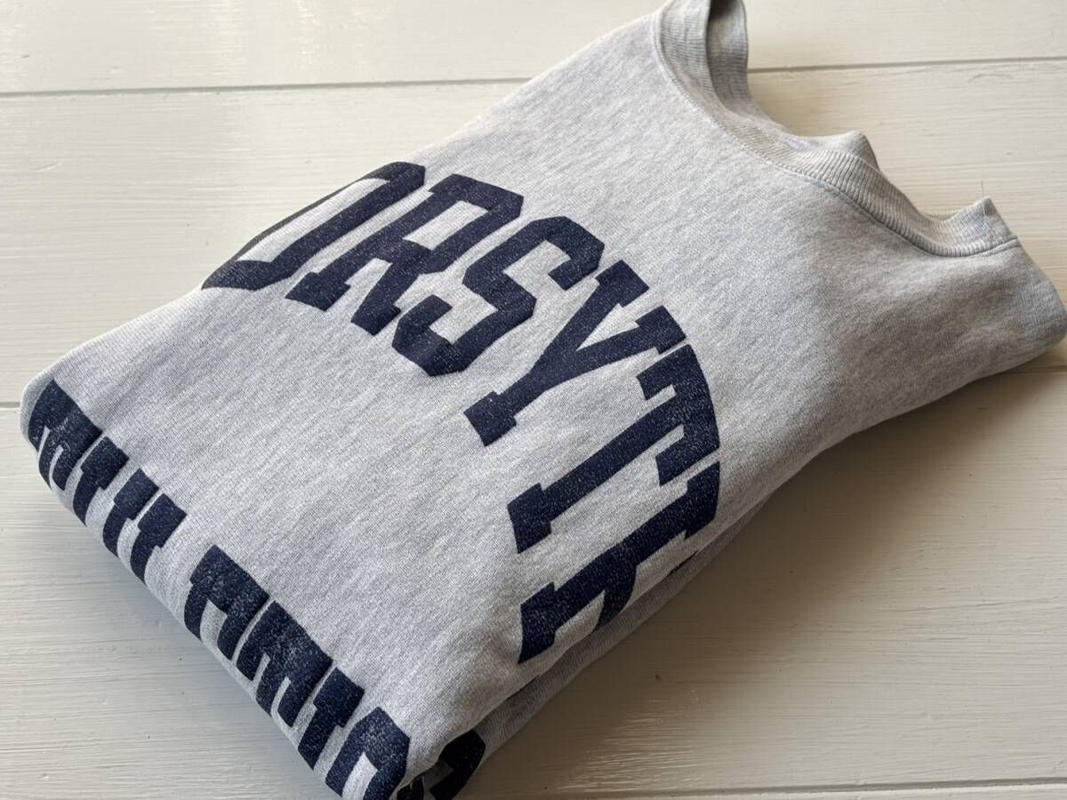 REVERS WEAVE SWEAT リバースウィーブ スウェット 状態: 米国製 MADE IN USA 古着 表記サイズ: MEDIUM 実寸: 着丈約67cm 身幅約49cm 肩幅約44cm 袖丈約61cm 素材: コットン89% アクリル8% レーヨン3% カラー: シルバーグレー 『 Champion チャンピオン REVERS WEAVE SWEAT リバースウィーブ スウェット 』 ・米国製 90年代の前期刺繍タグです。 チャンピオンらしいシルバーグレーのボディにFORSYTH ATHLETICSのプリントがある本格スウェットです、プリントも程よく剥げてきて、いい雰囲気です。袖にCマークがあります。 ・古着特有の着用感はありますが、目立つ汚れやダメージは見受けられません。年代のわりにコンディションも良く古着慣れされた方なら問題ない状態かと思います。わずかなステッチのホツレや首元のわずかな黄ばみ、目立たない穴はご了承ください。出品前に洗濯済みです。 ・今回、コレクションしていた80年代90年代のコンディション良好チャンピオンスウェットを多数出品しましたので、是非ご覧ください。 | ||||