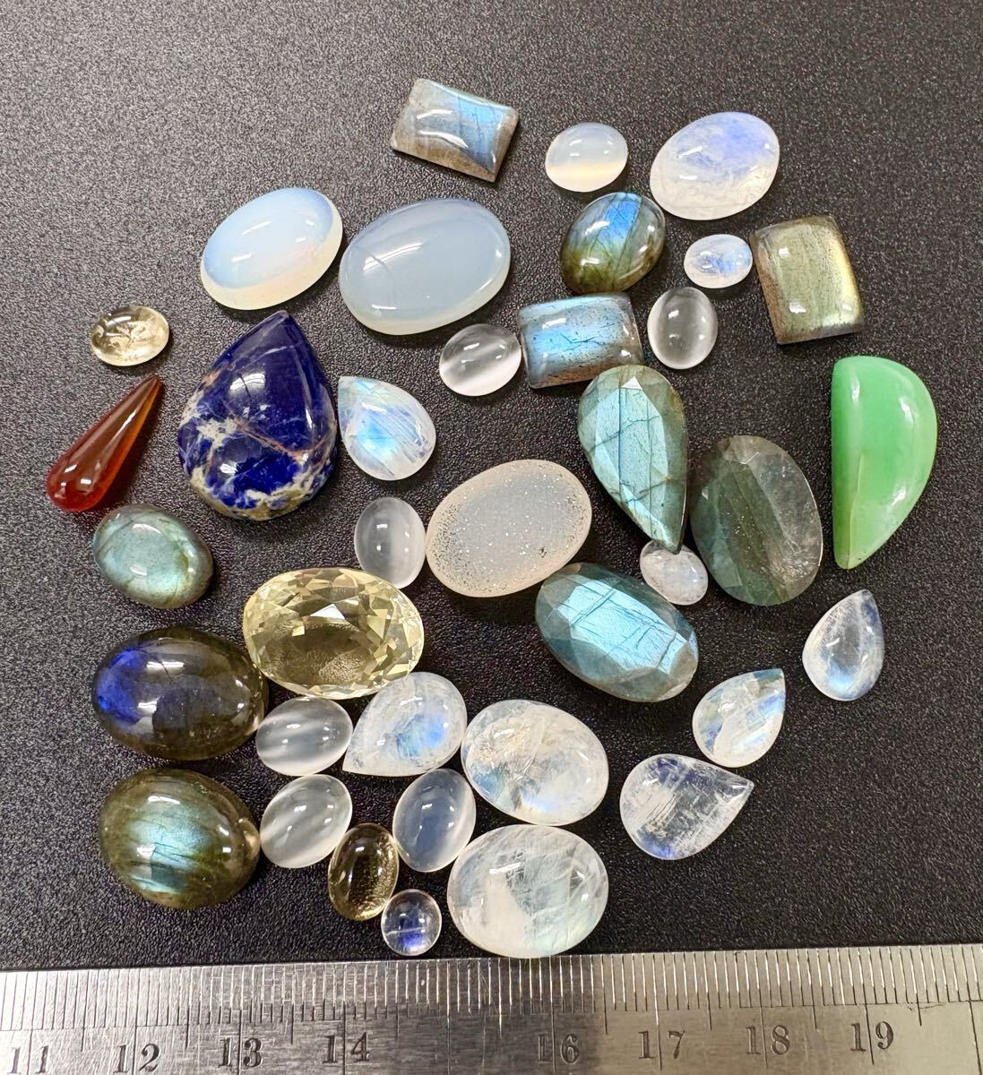 ムーンストーンやラブラドライトなどブルーシラーの多いカボションルースの纏めです。その他にソーダライト、アゲート、レモンクォーツのファセットカットなども有ります。重量56g。