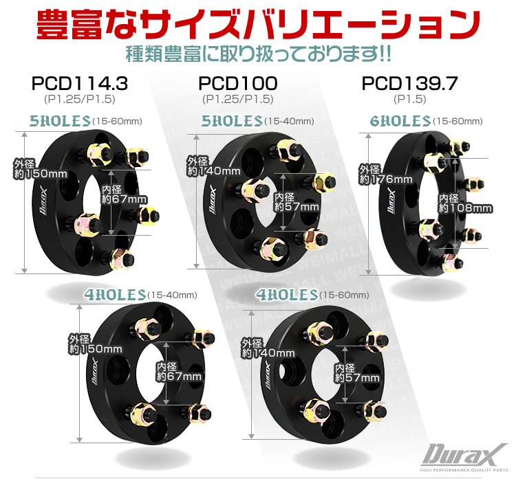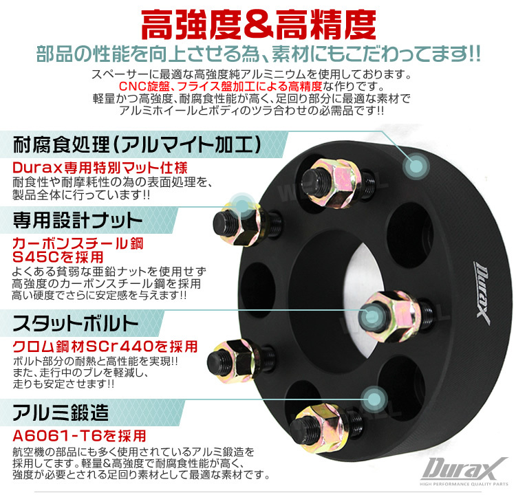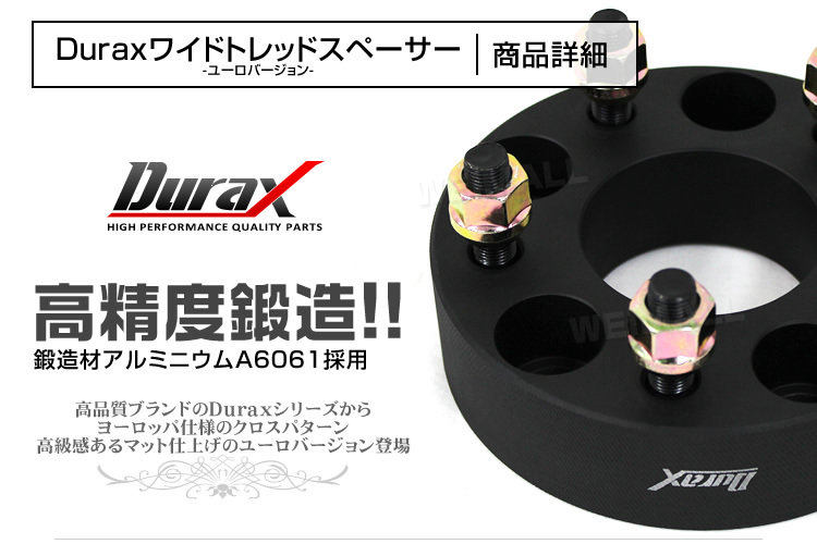 Duraxロゴ入り、限定マットブラックワイドトレッドスペーサー! 個性的なツライチセッティングに!! アルミニウム合金の無垢材を鍛造、T6処理で更に強度を高めた後、高精度で切削加工を施し、 レーザー彫刻によるロゴをあしらった高級感溢れるワイドトレッドスペーサーです。 腐食対策として陽極酸化処理(アルマイト)を行っておりますので 長期間使用により錆を軽減、長期間の使用においても、高い品質を維持します。 ホイールとボディのツラ合わせの必需品です。 専用ナットも付属しています。 ■商品コード:WS0115 ■商品仕様 色 :マットブラック 外径:約150mm ハブ径:約67mm PCD:114.3mm 穴数 :5穴 ネジピッチ :M12×P1.25 厚み :15mm 素材:鍛造アルミ合金 A6061-T6 スタッドボルト:クロム鋼 SCr440 貫通ナット:19HEX カーボンスチール S45C プロセス:CNC旋盤、フライス盤加工 表面処理:耐腐食ブラックアルマイト処理 ■内容 鍛造ワイドトレッドスペーサーDuraxマットブラック2枚1セット 専用ナット ■注意事項 ・インパクトレンチは絶対に使用しないでください。 ・装着ホイールの裏側に「逃げ」がある場合はワイドトレッドスペーサーの取り付けは可能ですが、 「逃げ」がない場合、または「逃げの深さ」が不十分な場合は取り付け出来ない場合がございます。 ・必ずPCD、ネジ穴、ネジピッチ、ハブ径を確認ください。 ・スペーサーの厚みに対し、ハブボルトの長さが十分に足りているか確認お願いいたします。 ・現車の仕様をご確認の上、ご落札お願いいたします。 ・適合車種の問い合わせのサポートは行っていません。 ■保障期間 7日間 ※商品到着後7日以内の初期不良・破損のみご対応させていただきます。 【新品未使用品です】 |