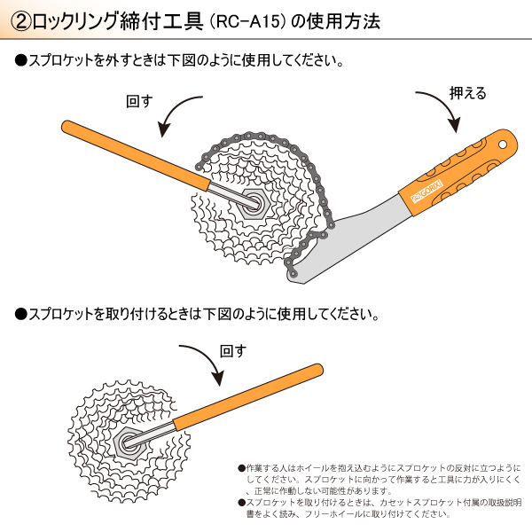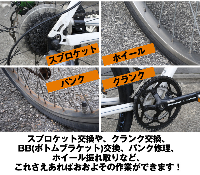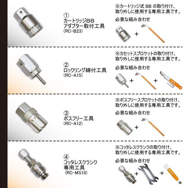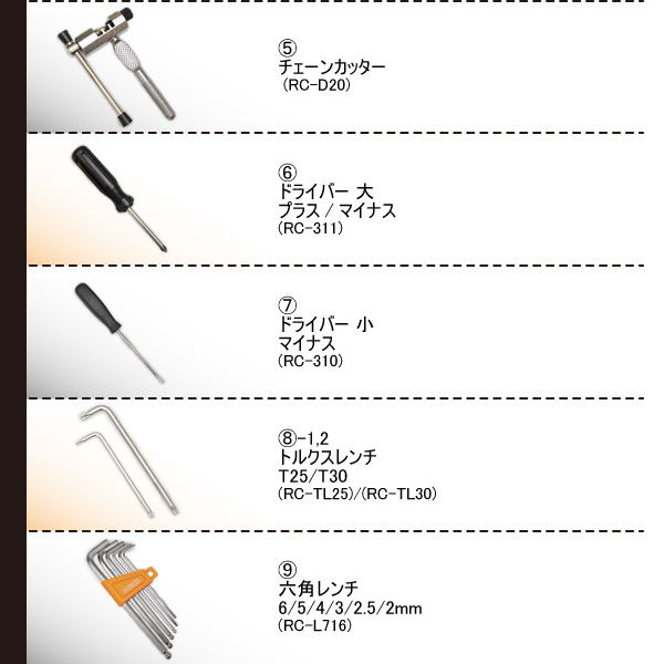ゴムのり、パッチ大x2 小x4、やすり、虫ゴムx2 ・ハブコンレンチ x2 13/14/15/16mm (RC-W502) ・六角レンチ 8mm + スクエアアダプター (RC-L81) ・ペダルレンチ 15mm + 14/15ボックスレンチ (RC-W501) ・チェーン式フリーホイール外し (RC-AF862) ・BBレンチ シマノ製ホローテック2 BB対応 (RC-C603) |