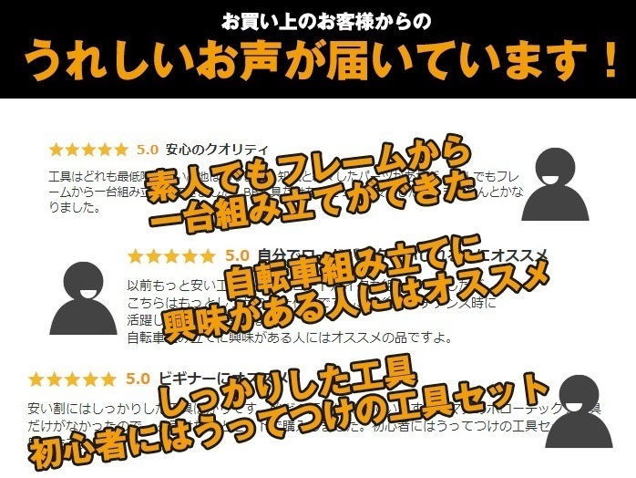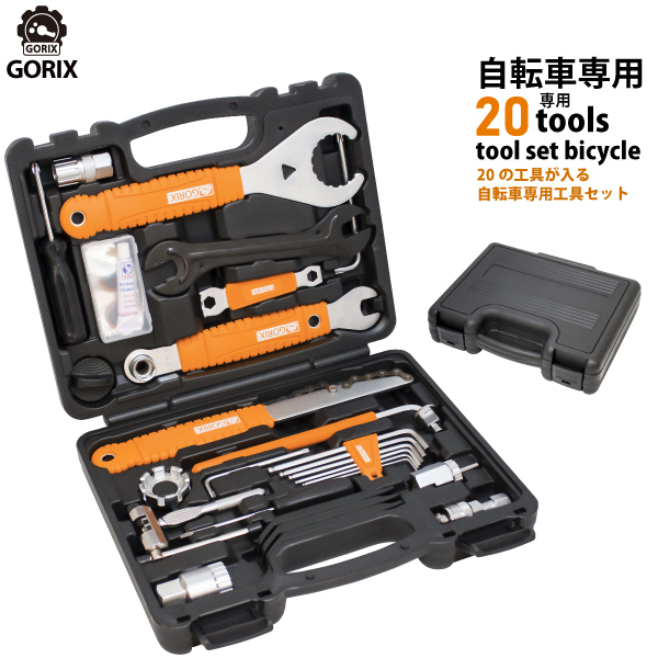 自転車専用工具 ロードバイクやマウンテンバイクなどのメンテナンスに! スポーツ自転車からママチャリまで、自分でメンテナンスやパーツ交換ができる自転車専工具セットです。 合計20種類の工具の組み合わせでスプロケット交換や、クランク交換、BB交換、パンク修理、ホイール振れ取りなど、様々な作業に対応します。 自転車専用の特殊工具がひとつのセットになっているため、これさえあればおおよその作業ができます。 内容 収納サイズ:横幅31x高さ7.5x奥行き25cm 総重量:2,6kg 【セット内容】 ・カートリッジBB取付工具(RC-B23) ・ロックリング締付工具(RC-A15) ・ボスフリー工具(RC-A12) ・コッタレスクランク専用工具(RC-MS18) ・チェーンカッター(RC-D20) ・ドライバー 大 プラス/マイナス 差し替え式(RC-311) ・ドライバー 小 マイナス (RC-310) ・トルクスレンチ T25/T30 (RC-TL25/RC-TL30) ・六角レンチ 6/5/4/3/2.5/2mm (RC-L716) ・ニップル回し (RC-Z8)