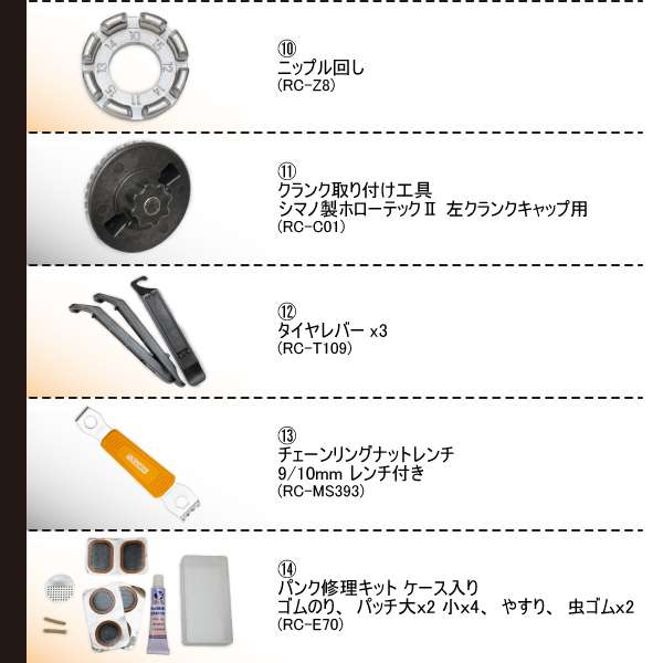 ・クランク取付工具 シマノ製ホローテック2 左クランクキャップ用 (RC-C01) ・タイヤレバー x3 (RC-T109) ・チェーンリングナットレンチ 9/10mm レンチ付き (RC-MS393) ・パンク修理キット ケース入り (RC-E70)