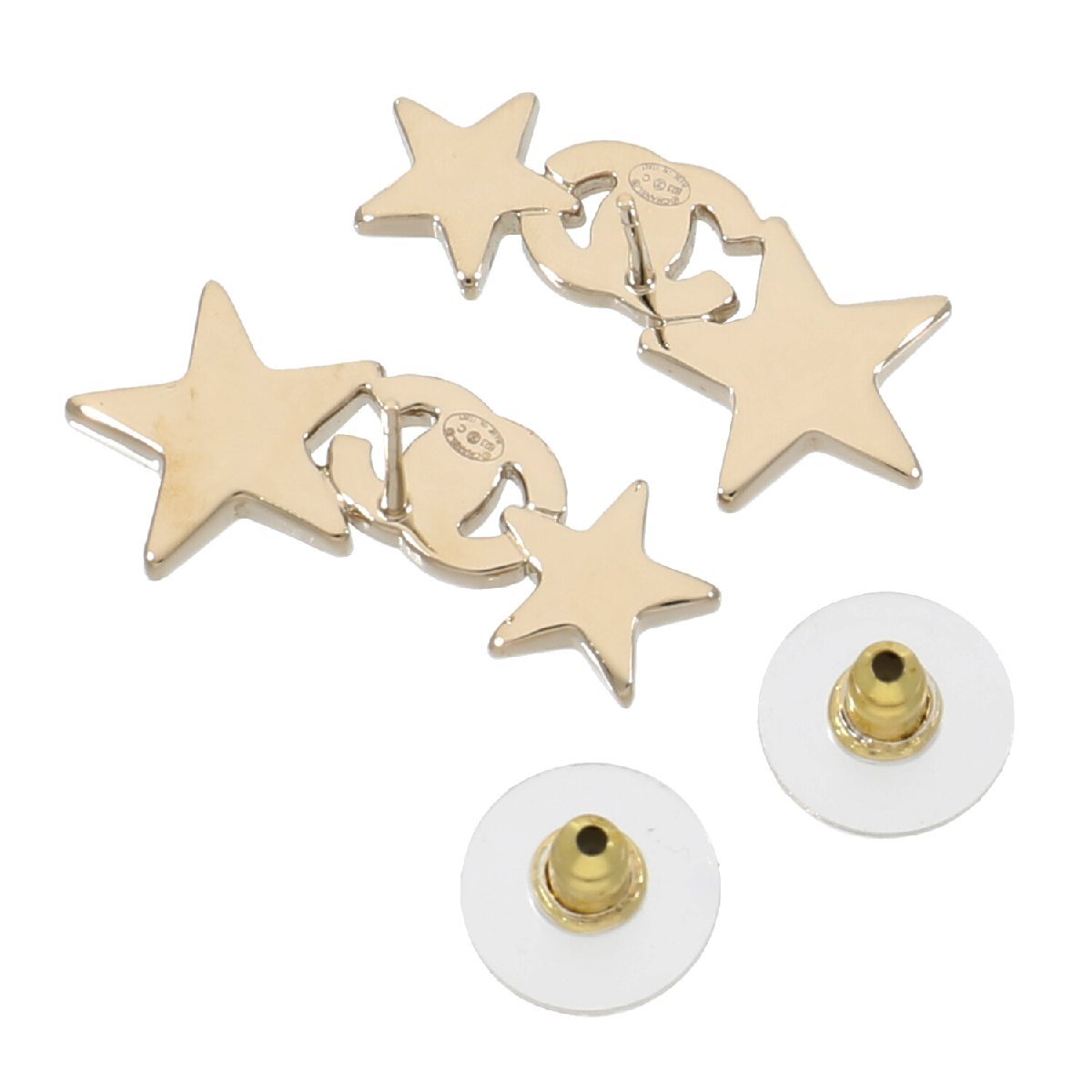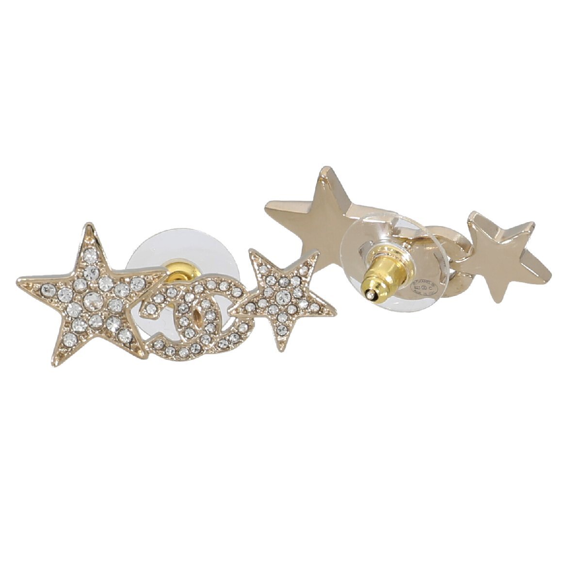 | モデルについて | フランス産まれのラグジュアリーブランドであるシャネル。シャネルのロゴである「ココマーク」と星を組み合わせた、インパクトのあるキャッチ型ピアスです。シャンパンゴールドカラーの台座にラインストーン装飾が施されており、華やかな服装にも、ロック系のファッションにも合わせることができます。 |