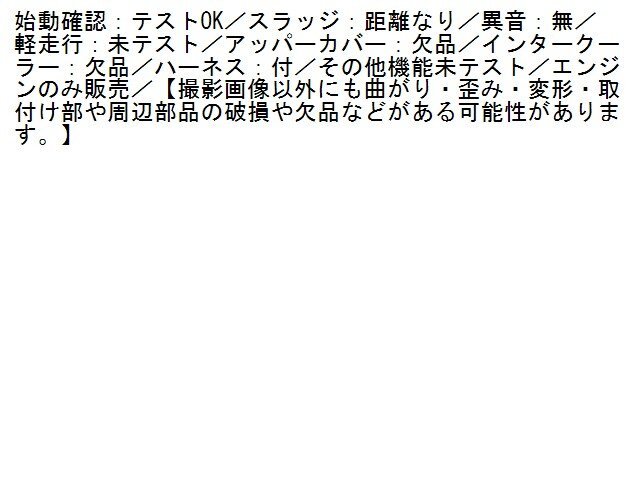 | 商品情報 | 始動確認:テストOK/スラッジ:距離なり/異音:無/軽走行:未テスト/アッパーカバー:欠品/インタークーラー:欠品/ハーネス:付/その他機能未テスト/エンジンのみ販売/【撮影画像以外にも曲がり・歪み・変形・取付け部や周辺部品の破損や欠品などがある可能性があります。】 | ||