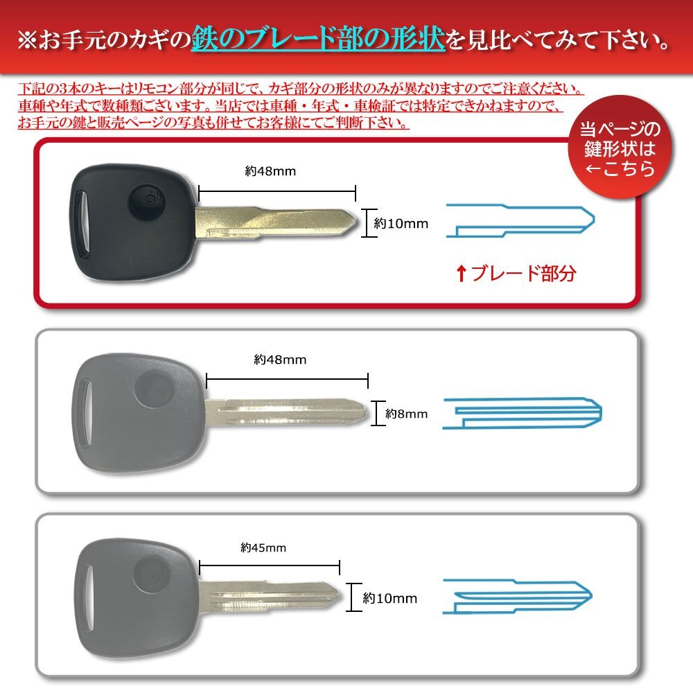 | 対応車種はあくまで参考です。 ブランクキーは同年式・同車種でもオプション等により数種類ございますので 車種、年式、型式などからは1種類に特定できず、 お手持ちのマスターキーと【形状、サイズ】を見比べてお客様に判断して頂く必要がございます。 また、キーレスのトランスミッター(送信機)は付属いたしません。 純正キーに内蔵されているものを引き継いでご使用ください。 ![]() ![]() ※こちらの商品はご注文受付後のキャンセル、返品は不可となります。 ※キーナンバーが分からない場合は未カットのブランクキーの発送となりますので、ご注意くださいますようお願い申し上げます。 キーレスのボタンが1ボタン仕様のブランクキーです。 スペアキー、鍵の折れ、割れ、傷汚れ等にお安く改善が可能です。 内部のキーレス送信機は付属致しておりませんので純正のものを流用下さい。 社外品のため、メーカーロゴは入っておりません。 車種や年式で数種類ございます。 当店では車種・年式・車検証では特定できかねますので、 お手元の鍵と販売ページの写真、リモコン部及び鉄のブレード部の形状を見比べて お客様にて判断していただくようお願い申し上げます。 ・ボタン数:1個 ・参考キーナンバー (キーナンバーだけでなく実際の鍵と掲載画像を必ずご確認ください) 50001 - 51308 ・参考車種 スズキ:エブリィ/スイフト/ワゴンR/セルボ/アルト/ジムニー/Kei マツダ:AZワゴン/MRワゴン/AZオフロード/スクラム/キャロル/ラピュタ 日産:モコ/ピノ など ・サイズ(キー部分):長さ:約48mm 幅:約10mm 厚さ:約2mm ・当店では車種・年式・車検証で特定できません。 画像のキー形状とカバー形状、サイズをお手元の鍵と比較しご確認ください。 ・イモビが付いている車種は送信機の中に組み込まれていますので、そのまま移植すれば問題なくエンジン始動できます ※ 一部イモビがプラスチック内等に埋め込まれている場合移設・加工が必要です ![]() ![]() ![]() ■注意事項 ・当店ではお車への適合の確認や取り付けに関するサポートはおこなっていませんので、お車への適合やご使用方法につきましては専門店さまなどにご相談ください。 ※製造・流通過程(商品同士の擦れ)において、商品に多少の擦り傷や汚れなどが発生する場合がございますのでご了承ください。 ※当商品はインポート商品の製品(バルク品)のため、メーカー保証書や説明書などは付属しておりません。 ※梱包は装飾された箱ではなく簡易包装での出荷となります。 |