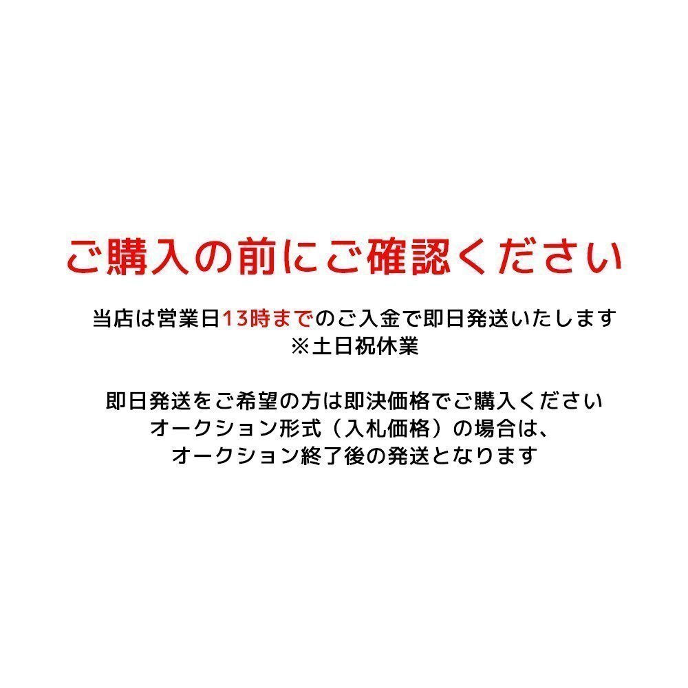 | ・代金引換の場合、メール便での発送はできかねます。 ・基本的にはノークレーム、ノーリターンでお願い致します。 ・土曜、日曜、祝日は定休日となります。休業日は全てのご連絡および発送は休日明けの対応となります。 ・画像はできる限りわかりやすく撮影していますが、画像の解像度やモニターなどにより色合いが異なる場合もございますので、参考程度にお考え下さい。 ・写真と実際の商品の外観が予告なく変わる場合がありますが、使用には問題ありません。 ・できる限り質問にはお答えしますが、どうしても不明な点もありますのでご了承ください。 ・返答に時間がかかる場合もございますので、早めにご質問などお願い致します。 ・神経質な方はご入札をお控えください。 ・落札後にキャンセルがあった場合は繰り越し落札は行いませんのでご了承ください。 ・即決価格を設定している商品以外の早期終了は考えておりませんので、最後までお付き合い願います。 ・落札後、1週間以内に取引完了が難しい方の入札はお控えください。 ・当ストアの定める規定期間内に連絡が付かない、または取引に進展がない場合はキャンセルさせていただく場合がございますのでご了承ください(当ストアの意思と関係なく、自動的に「非常に悪い」の評価が付いてしまいます)。 ・当ストアが入札妨害と判断した場合は入札を取り消す場合がごさいます。 ・上記指定の発送方法以外は対応いたしかねますのでご了承ください。 ・取付サポートは一切お受けできませんので予めご了承下さい。 |