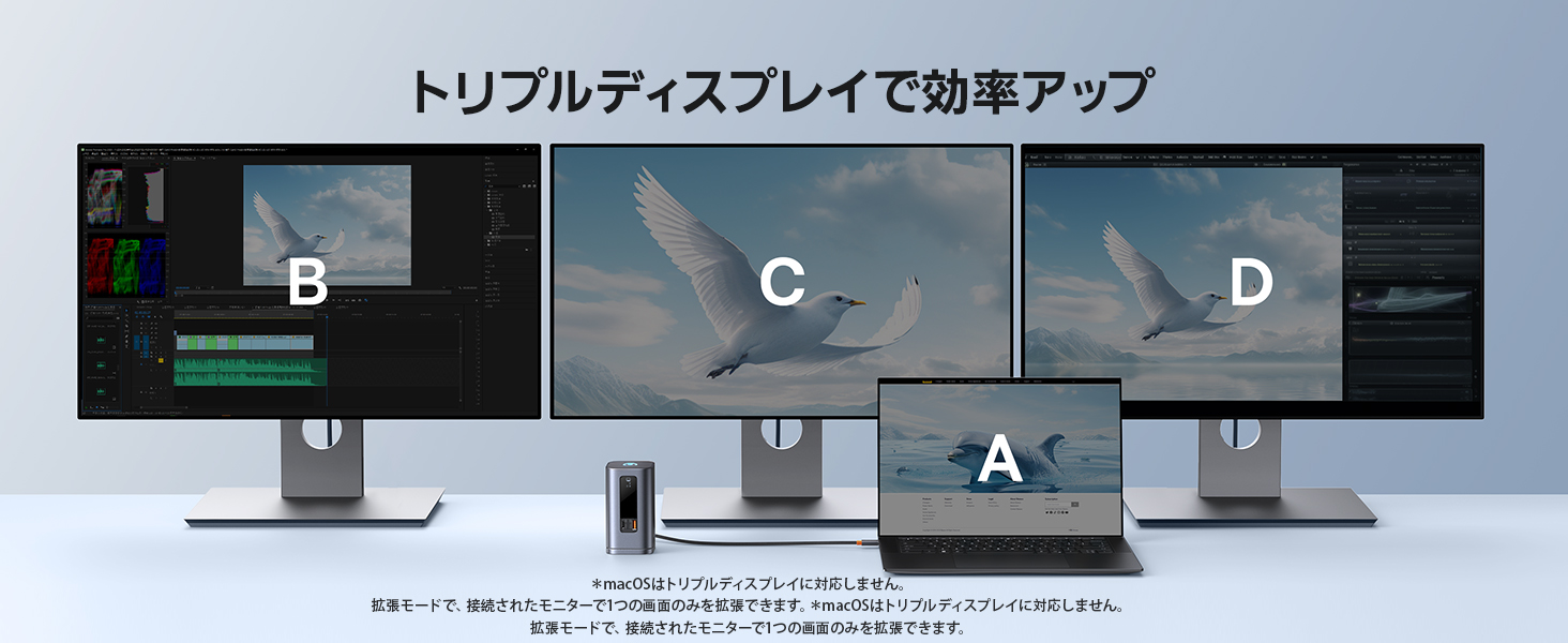 - 【効率的なトリプルディスプレイ(Windows)】 HDMIおよびDisplayPortポートにより、見事な4K解像度で外部ディスプレイを3台まで拡張でき、効率的なマルチタスクを実現します。このドッキングステーションは、プロ仕様の視覚機能で作業を強化します。(macOSシステムはトリプルディスプレイモードに対応していません。拡張モードで1つのディスプレイのみが拡張できます。複製モードに対応可能。)