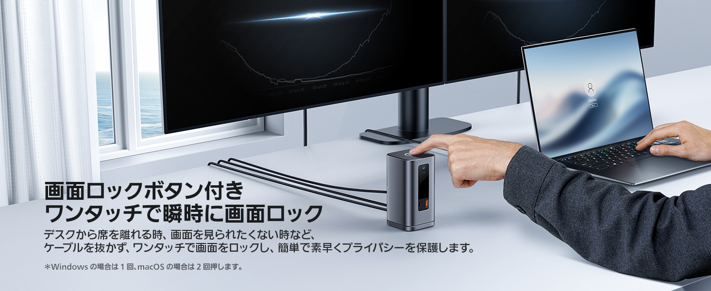 - 【画面ロックボタン・革新的なデザイン】コンパクトなタワー型、洗練されたアルミニウム仕上げ、マグネットベース付きのこのドッキングステーションは、ワークスペースを再定義します。従来の形状より省スペースで効率アップ。LEDディスプレイが各ポートの接続状態を表示します。更に画面ロック機能があり、一時的にパソコンを使わない時、画面を見られたくない時など、ワンタッチでノートパソコンのOSをロックし、簡単に素早くプライバシーを保護します。
