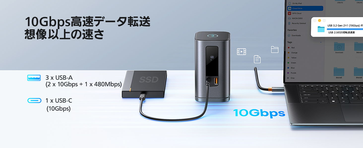 - 【10Gbps 高速データ転送】USB 3.2 Gen 2×1対応データポートが合計3つ(2xUSB-C + 1xUSB-A)、480Mbps対応のUSB-Aデータポートが1つを搭載し、従来のUSB 2.0より伝送速度が20倍に。時間を節約できます。