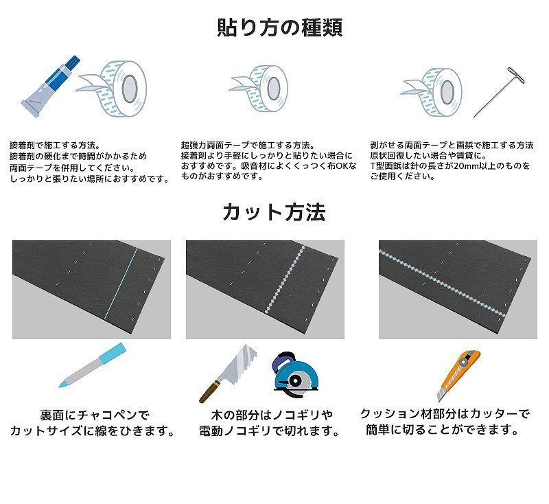 ■デザイン性と機能性を備えた吸音ウォールパネル 木と吸音クッション材を組み合わせた壁パネル軽量タイプで賃貸にも施工できます。 寝室やリビングなど反響や騒音を抑えつつお部屋を おしゃれな雰囲気に変えてくれます。 ■冷暖房効率UP クッション層の無双にある空気孔が温度を保つため遮熱します。 冷暖房効率が上がり消費電力を軽減します。 ■静かで落ち着いた暮らし 近隣からの騒音が気になるベッドルーム等の壁面に設置することで近隣からの騒音を軽減し、静かで落ち着いた生活ができます。 ■自由にカット クッション材の部分はカッターで切ることができます。 木材の部分も柔らかく加工がしやすくノコギリを使ってカットすることが出来ます。 軽量タイプ クッション材が基盤のウッドパネルなので1枚あたりの重量が約2kgと軽量。 施工効率が良く女性でも手軽にDIYすることが出来ます。 ■商品詳細 カラー:ナチュラルウッド サイズ(約):高さ800mm、横305mm、奥行き22mm 重さ(約):1枚あたり2kg 素材:木材(MDF)、吸音材:ポリエステル 施工面積(約):1.44平方メートル |