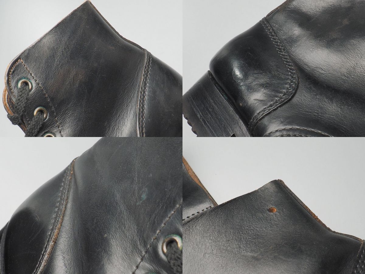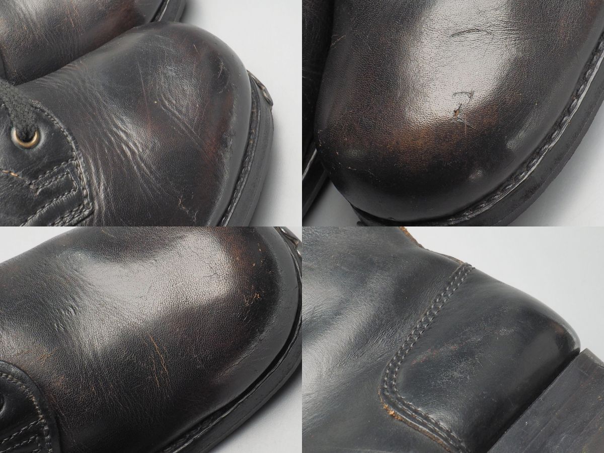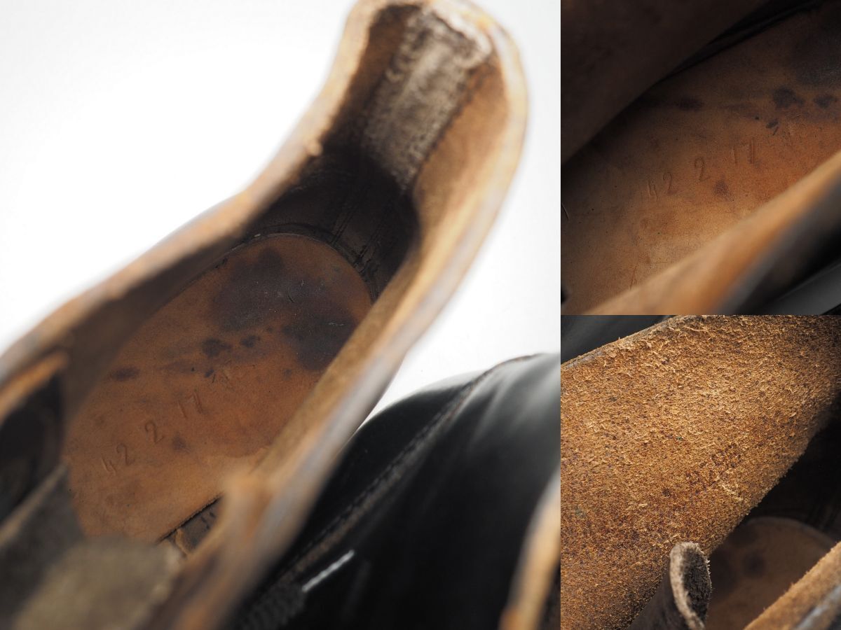 【コンディション詳細】 シューレースは交換されておりますので予めご了承ください。 また、エラーか或いはインソールが交換されているものと思われますが、アウトソールとインソールでサイズ表記が異なっております(アウトソール「43」、インソール「42」)、着用には支障ないかと思われますが同様にご留意お願い致します。 ほかアッパーのシワ、所々の擦れキズ、表面の細かなクラック、また退色により全体的に茶味がかった色合いとなっておりますが、味わいとしてご理解いただけますと幸いです。 またハトメの緑青、左足のシャフトに1か所パンチ穴、インソールやライニングの擦れや汚れ、シミなどございますが、その他支障になるようなダメージ等はなくこれからも十分にご愛用いただけるコンディションです。 アウトソールの減りはトゥで2mm程度、ヒールで3mm程度、現状で着用に支障はございませんが、ソールのビスにビス抜けやネジ頭の潰れがございます。 |