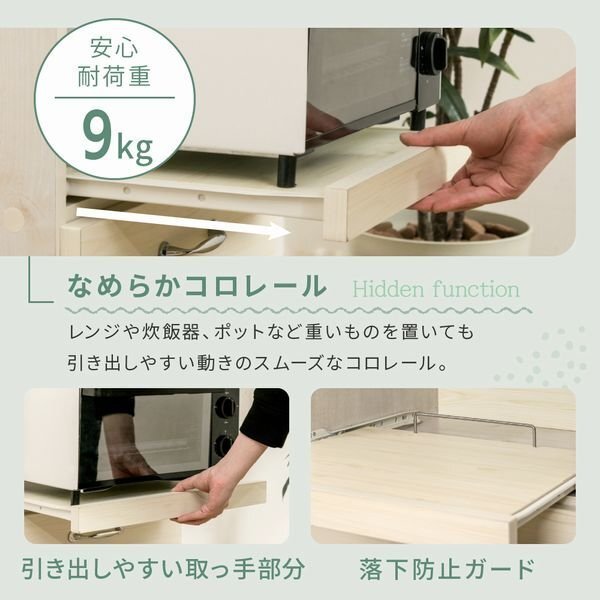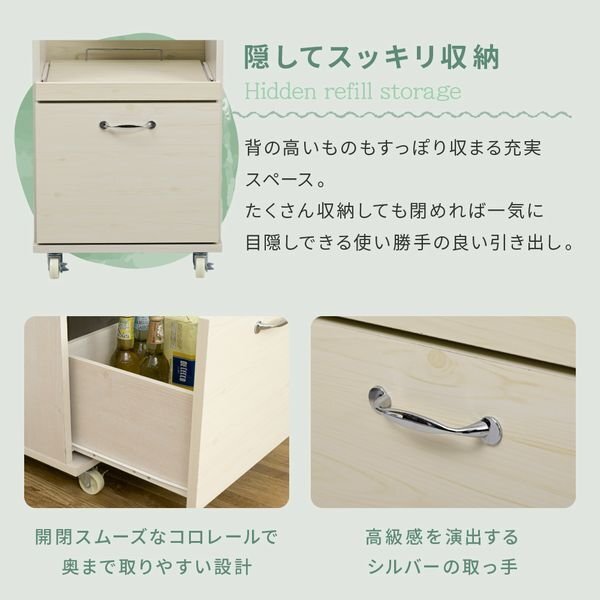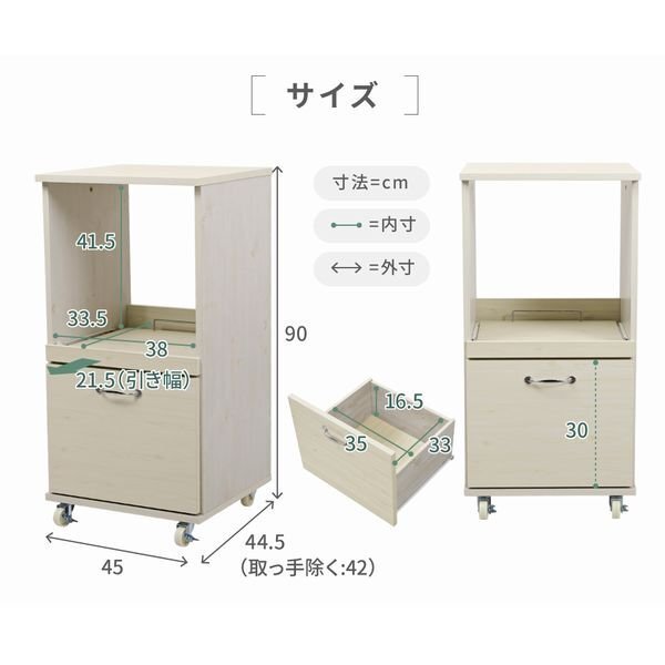 | 【カラー】 ホワイト 【サイズ】 <外寸> 幅45×奥行44.5×高さ90cm <内寸> スライド部:幅38×奥行33.5×高さ41.5cm スライド引き幅:21.5cm 引き出し:幅35×奥行33×高さ16.5(有効30)cm 【材質】 天板・前板・スライド棚:合成樹脂化粧合板(PVC) 本体:プリント紙化粧合板 【耐荷重】 天板:(約)10kg以下 スライド棚:(約)9kg以下 引き出し:(約)7kg以下 【生産国】 中国 【梱包】 サイズ:86.5×45.5×17.8cm、重量:18.3kg 【その他】 ・背面化粧有り ・キャスター4個(うちストッパー2個) 【組み立て品】 お客様による組み立てが必要です。 【ご注意】 ・サイズ、重量は概算です。 ・商品カラーはご使用のモニターによって実際の明るさや色と異なって見える場合がございます。 |