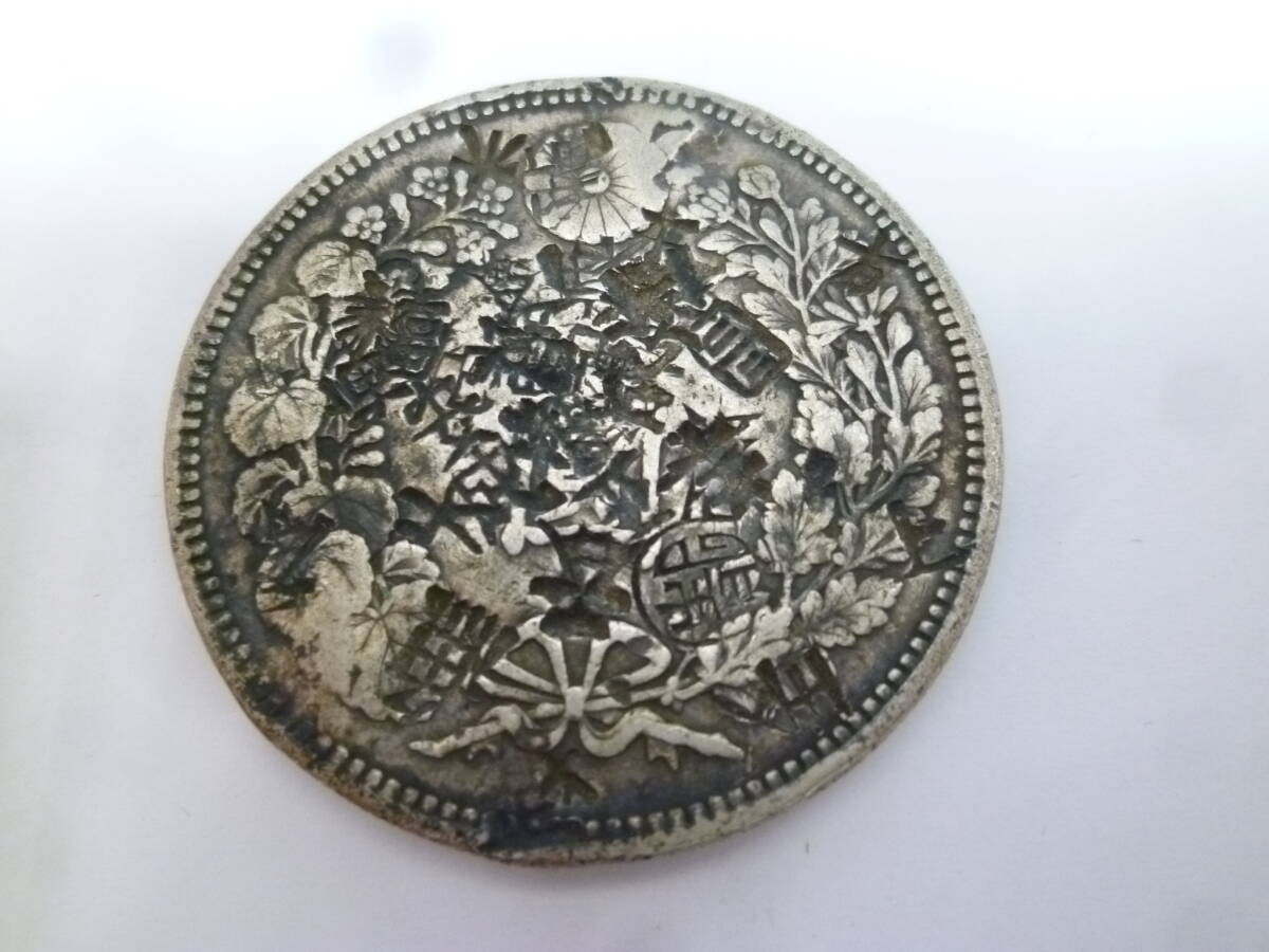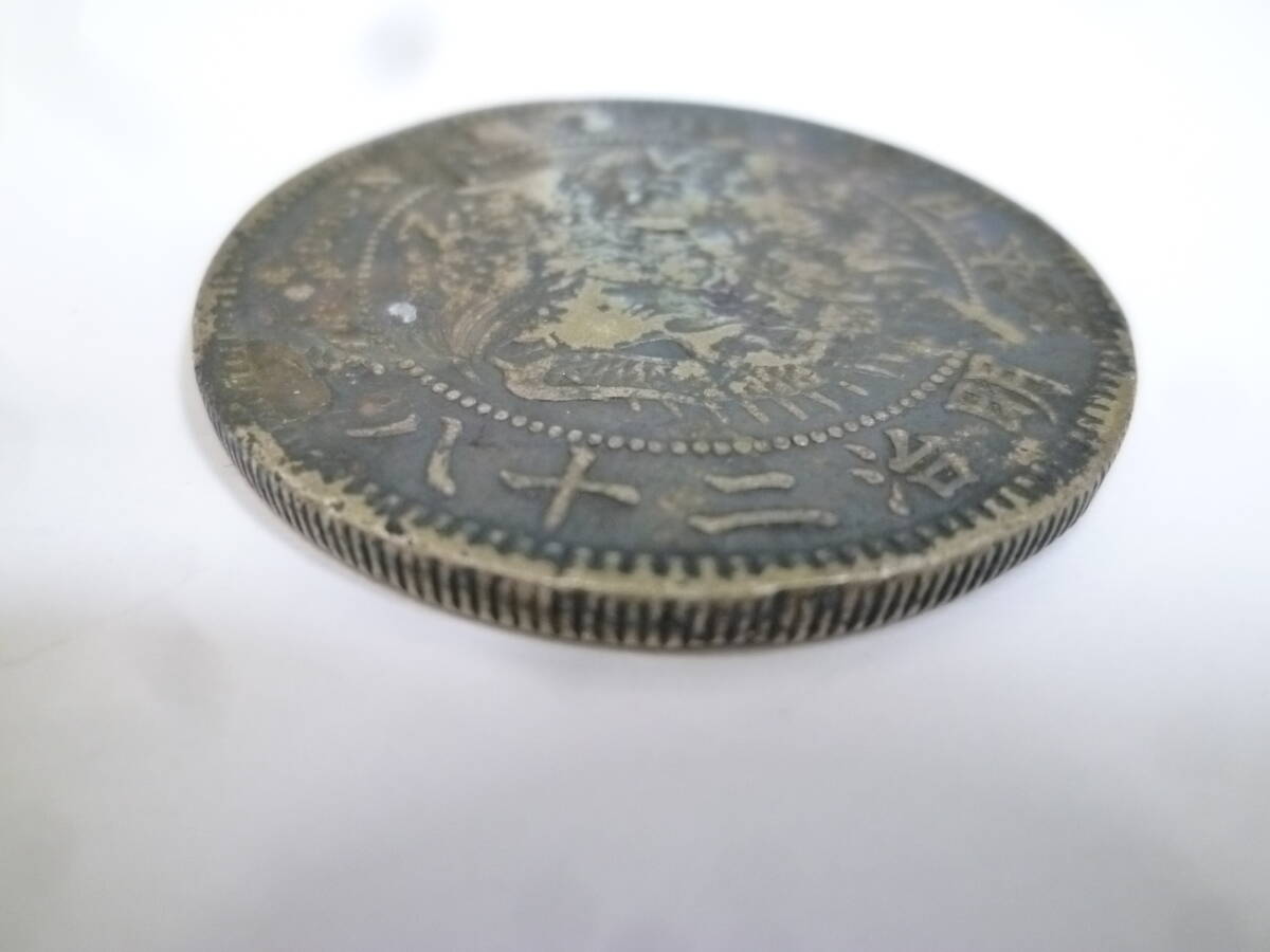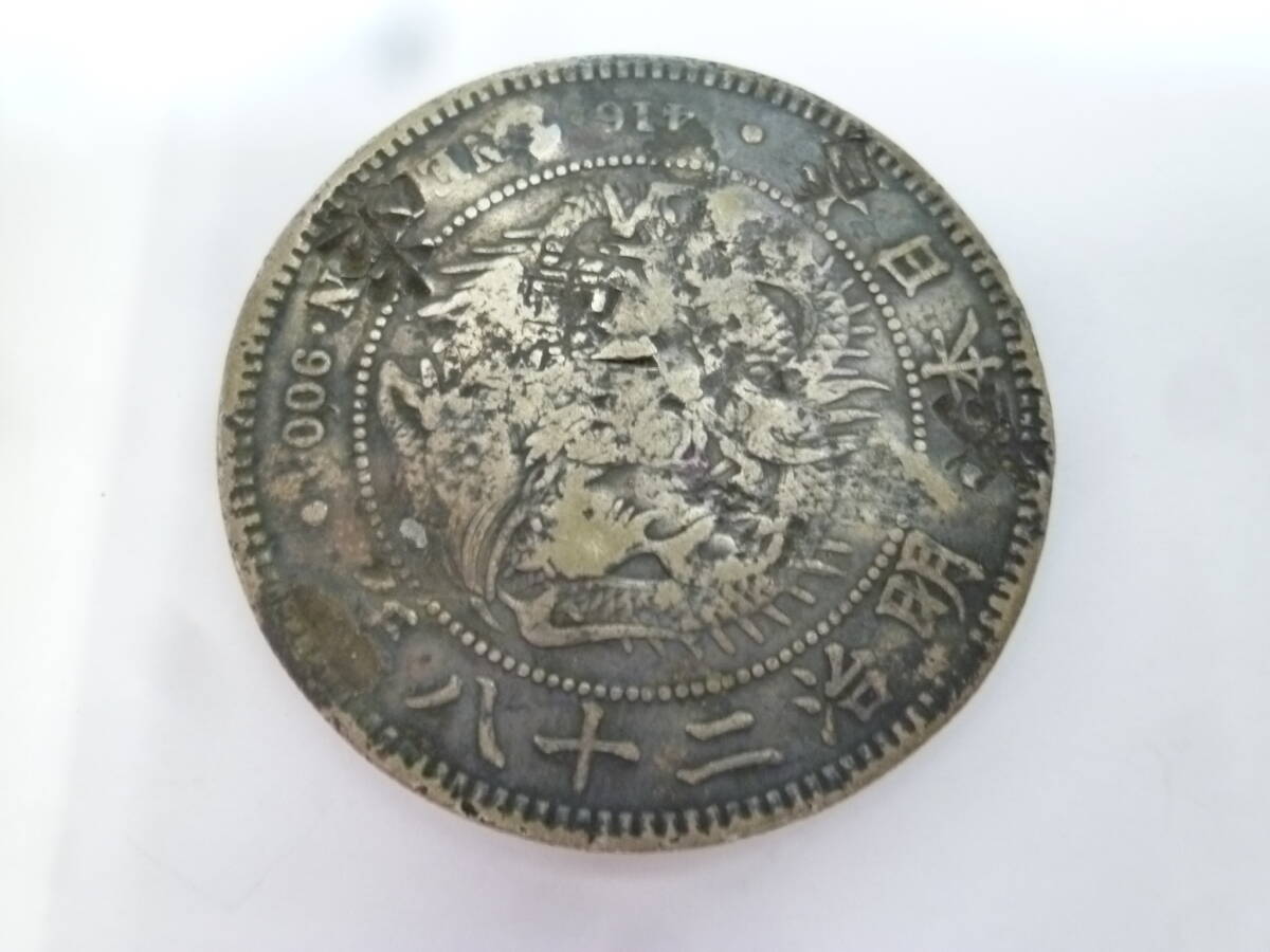 | #42222 【コレクター放出品】 新1円銀貨? 一圓銀貨? 明治28年 チョップ打ち 刻印潰れ 詳細不明 約26.8g 比重値 10.21 現状品 | ||