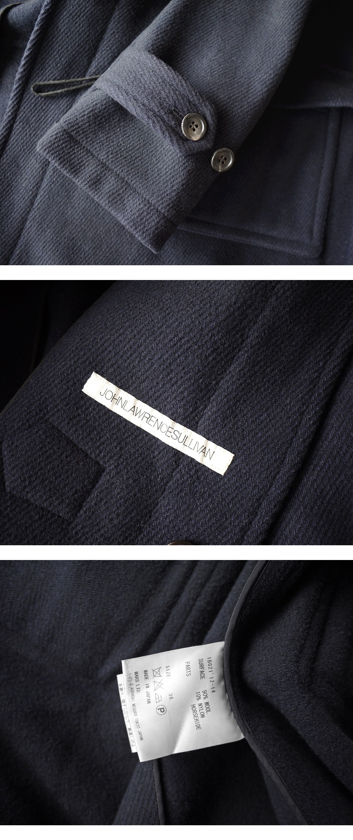 brand JOHN LAWRENCE SULLIVAN made in Japan price \120,000(参考上代) material wool 90% nylon 10% color Navy サイズ 36(34-38展開M相当) 肩幅44 着丈88 袖丈62 身幅50 (多少の誤差はご了承ください) 状態 比較的使用感の少ないきれいなお品物です。特筆すべきダメージは見受けられず末永くご使用頂ける状態です。 |