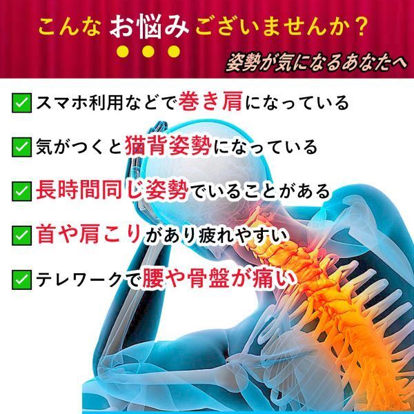 こんなお悩みはございませんか? スマホ利用などで巻き肩になっている。 気がつくと猫背姿勢になっている。 長時間同じ姿勢でいることがある。 首や肩こりがあり疲れやすい。 テレワークで腰や骨盤が痛い。 【美しい姿勢へ】 長時間のデスクワークやパソコン・スマホの使い過ぎで、身体の歪みが気になってる方へ。 そんな悩みを解消し美しい姿勢を保つために開発された姿勢矯正サポーター! 正しい姿勢を自然と意識することで、肩を開いて姿勢をサポートします。 【優れたサポート力】 ・本体背面に固定ボーン2本が内蔵することで正しい姿勢へと導きます。 ・たすき掛け構造のため、軽い力で背中全体をアポートします。 ・上部がY字構造になっているため滑らかに肩のラインにフィットします。 【通気性抜群】 全体にメッシュ素材を使っていますので、通気性が向上。 【こんな方にオススメ】 長時間のデスクワーク、スマホ操作、読書、ゲーム、長距離ドライバーなどのような方におすすめです。 長時間の同じ姿勢や、間違った姿勢にならないように、着用するだけでサポートしてくれます。 美しい姿勢を習慣化して理想の美しい姿勢を保ちましょう。 【豊富なサイズ展開】 S、M、L、XL、XXLの6サイズ展開。 ご自身にピッタリのベルトをお選び頂けます。