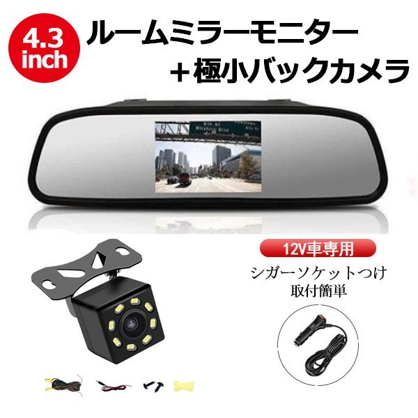 4.3インチ ルームミラーモニター LED 12V車専用 バックカメラ 車載 2系統 映像入力 取付簡単 ルームミラー型モニター シガーソケット 010