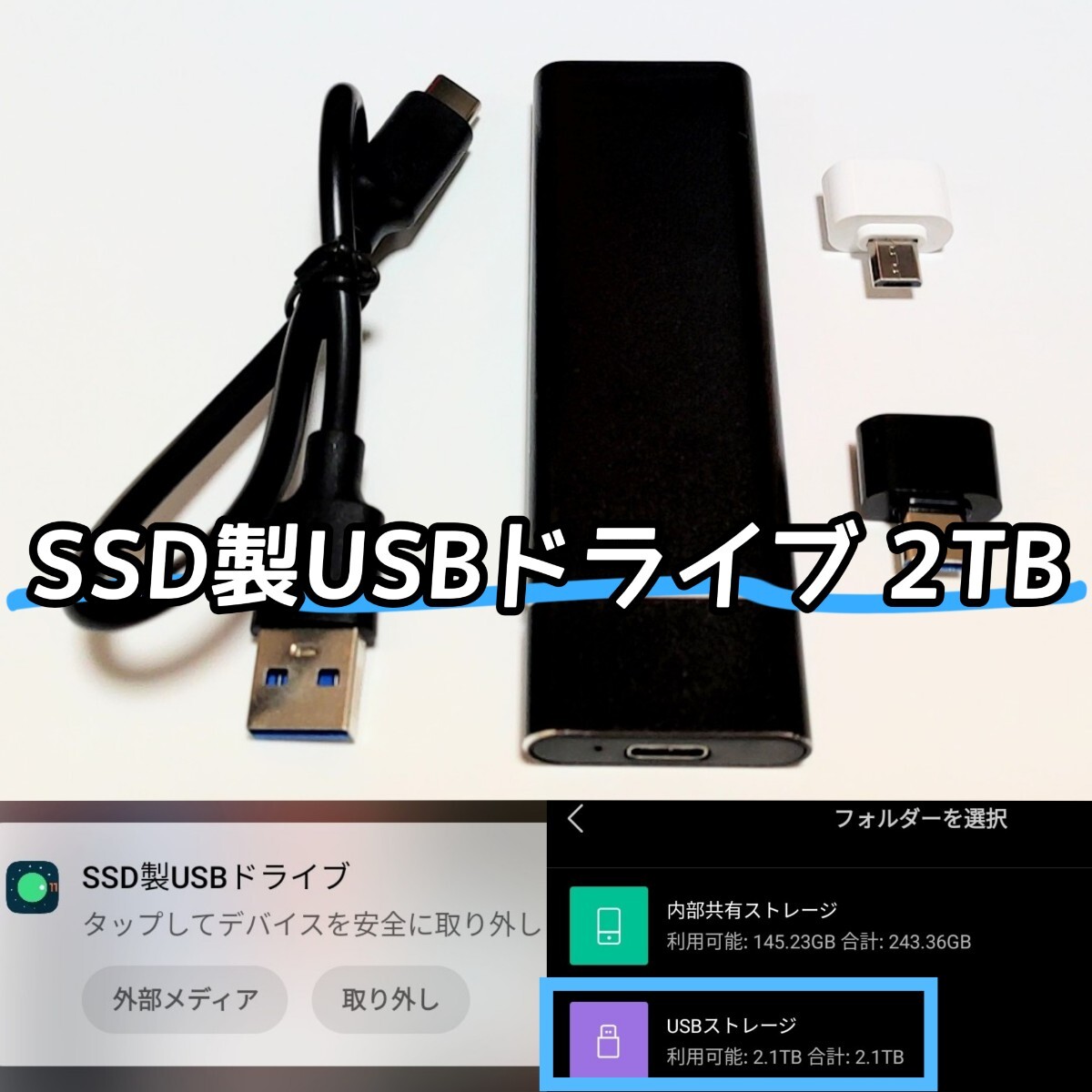 当商品は USB-タイプC接続の2TB外付けポータブルSSDであり、スマートチップ搭載によりデータ保護が強化されています。2TBポータブルSSDの価格帯参考値を以下に掲示しますが、当商品は超激安&大容量のために転送速度が犠牲となっています。速度調査では 当商品と同一の2TBポータブルSSD と 2019年発売のスマホを用いましたが、発送する商品は未使用品となります。| 出价者 | 信用 | 价格 | 时间 |