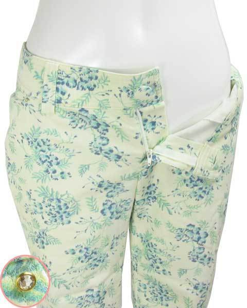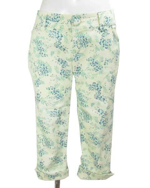 | 薄いイエローにブルーの花柄の華やかなパンツ。シンプルなトップスを合わせたカジュアルコーデからフリルのブラウスをあわせてキレイ目コーデまでお楽しみいただけます。ストレッチが入っていて、はき心地が良いです。 |