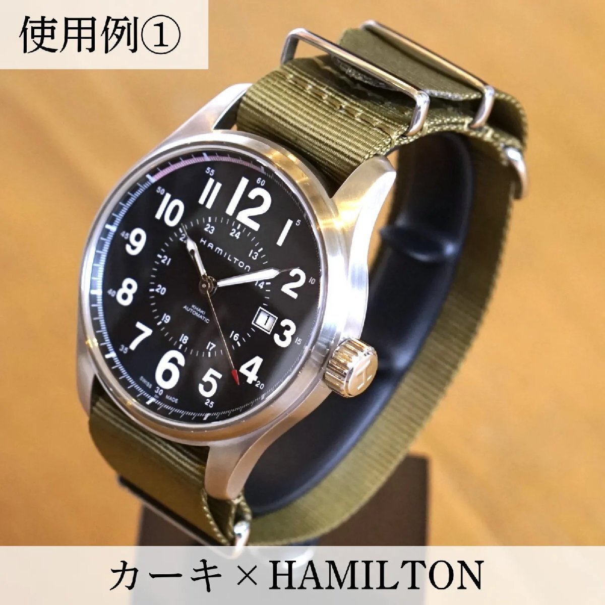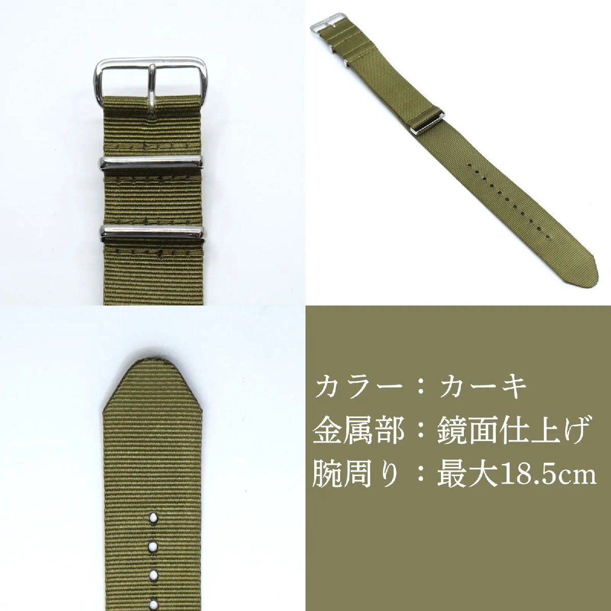 シンプルなデザインで、ミリタリー系の時計によくマッチします。 通気性が良く、アウトドアなど汗をかきやすいシーンに最適です。 工具不要で取り換え可能なので、シーンに合わせて色を付け替えるといった使い方も可能です。 ※お取付けに工具は不要ですが、お使いのバンドによっては取り外しにバネ棒・工具を必要とする場合がございます。ご不明点があればお気軽にご質問ください。 【商品詳細】 ● 厚さ:約1.0mm ● 長さ:男性サイズ ● カラー数:グレー、カーキ、ブラック ● 取付幅:22mm ● 腕周りサイズ:グレー、カーキ / 最大約18.5cm、ブラック / 最大約20.0cm ※取り付ける時計のサイズによって多少前後します。 ※バネ棒は付属しておりません。 ※画像の時計は付属しておりません。 ※商品画像の色調は、一部実物とは異なる場合があります。 ※落札後、1~2営業日以内で発送いたします。 ※デッドストック商品につき、細かな傷や軽微な汚れのある商品を含みます。完璧な商品をご希望のお客様はご購入をお控えいただきます様お願いいたします。