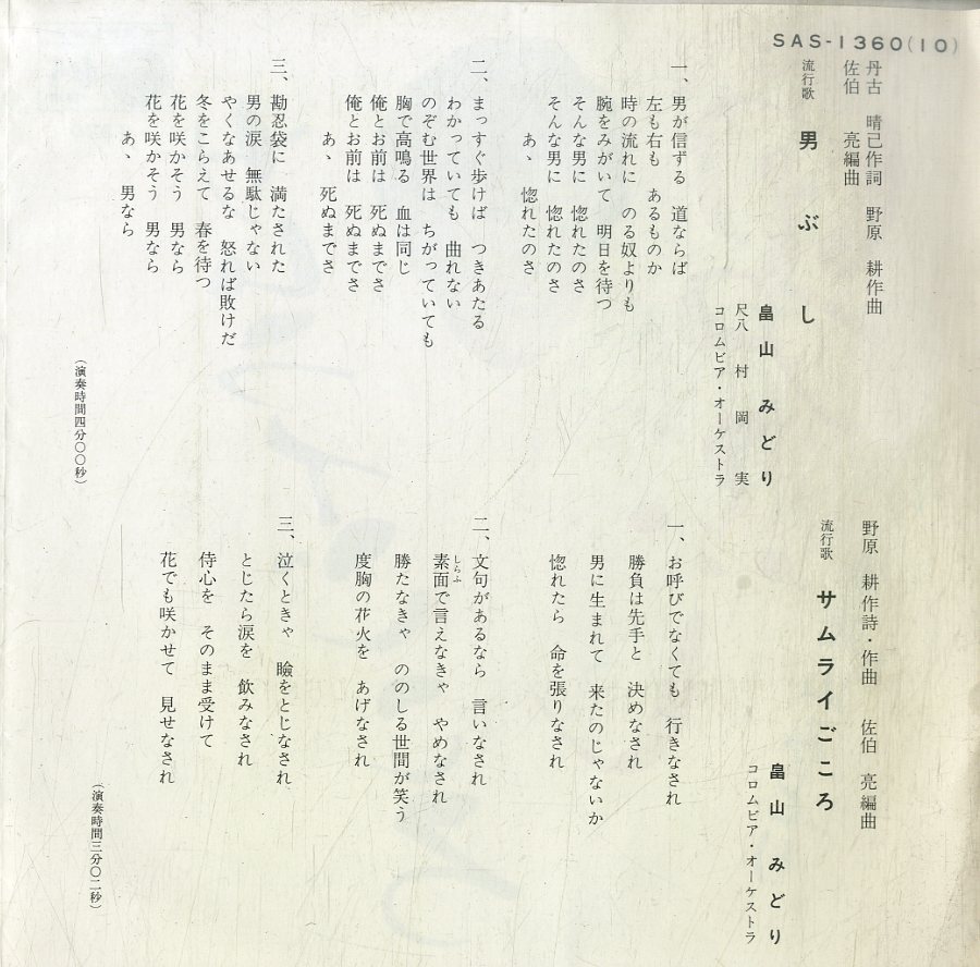 C00202234/EP/畠山みどり「男ぶし / サムライごころ (1969年・SAS-1360)」
