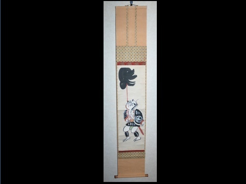 江戸時代初期に滋賀県大津市で制作・販売された初期大津絵の槍持奴図です。江戸時代初期に制作・販売された初期の大津絵は、本紙が一枚紙でなく縦長の紙を縦に2枚つなぎ合わせているのが特徴です。出品した本紙の中央部に縦長の2枚の紙を縦につなぎ合わせたつぎ目が横一列に並ぶ状態ではっきりと見ることができます。画像にてご確認下さい。槍持奴とは、毛槍を担ぎ大名行列の先頭を歩く奴のことです。槍持奴は、まさに大名家の威光を知らしめるかのように、往来をへいげいし、居丈高に練り歩いています。槍持奴の威勢のよさは庶民の憧れでもあったようです。大津絵の槍持奴図は、道中安全の護符として旅人に売られていたようです。大津絵とは、江戸時代初期から滋賀県大津市で制作・販売されていた民俗絵画。東海道を往来する旅人のお土産や護符として用いられていた。仏画を起源としながら、風俗画やユーモラスな戯画へと発展し、『槍持奴』や『鬼の念仏』、『藤娘』などが代表的な画題である。大胆な筆致と原色使いが特徴で、庶民の間で育った大衆芸術であり、合羽摺で輪郭を転写し、細部を手彩色する方法が採られました。 本作品は、使用による経年感はありますが、特に目立った傷みなどは見当たらず概ね良好です。画像にてご確認下さい。