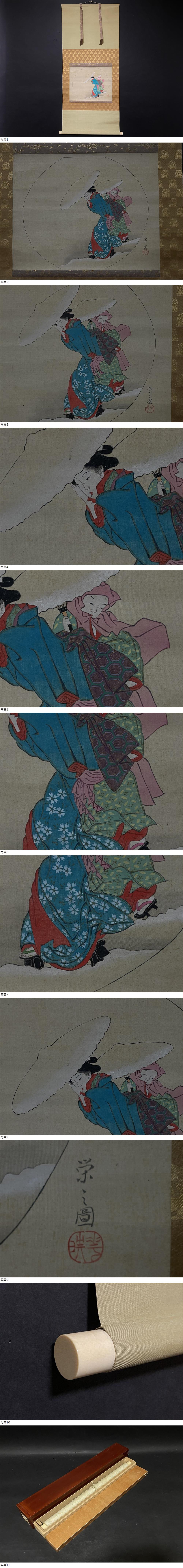| 【真作】 掛軸 鳥文斎栄之 浮世絵師 江戸期 雪中美人 肉筆 絹本 着色 日本画家 時代 二重箱 |