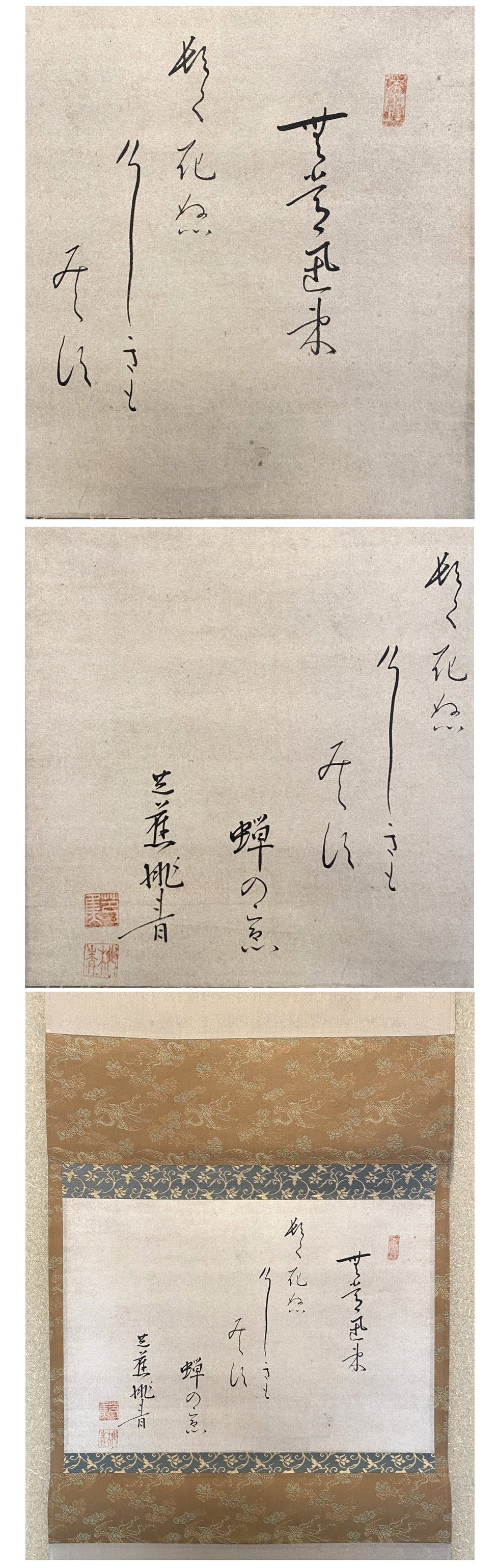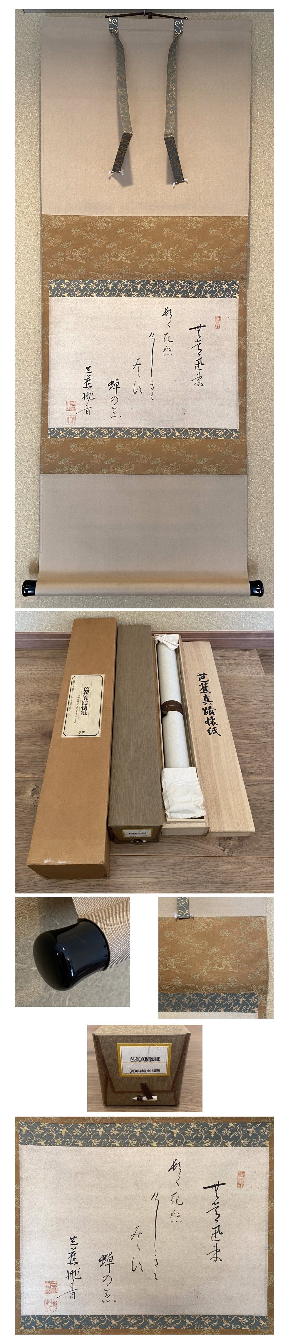 掛軸 紙本 裂の三段表装風帯付き 桐箱(二重のタトウ) 読みは、無常迅束 頓て死ぬ けしきもみえず蝉のこゑ です。