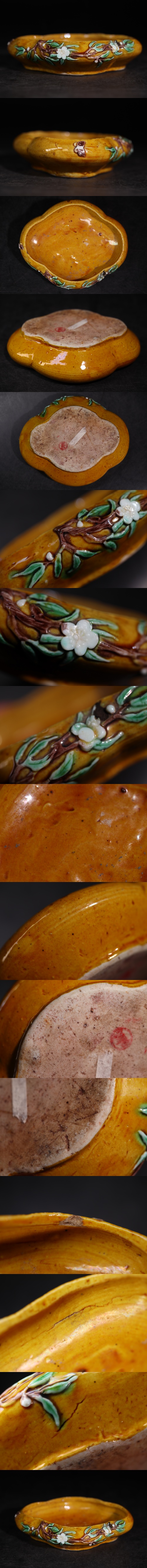 | 時代 黄交趾 草花紋 花形 水孟 / 中国美術 交趾 書道具 文房具 煎茶飾 .G3890 |