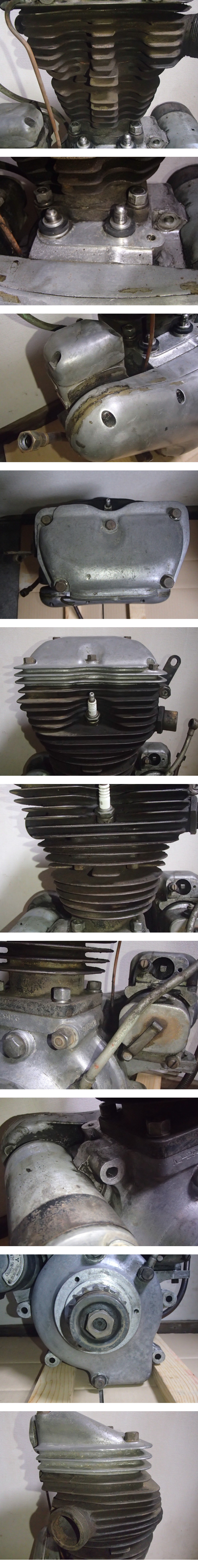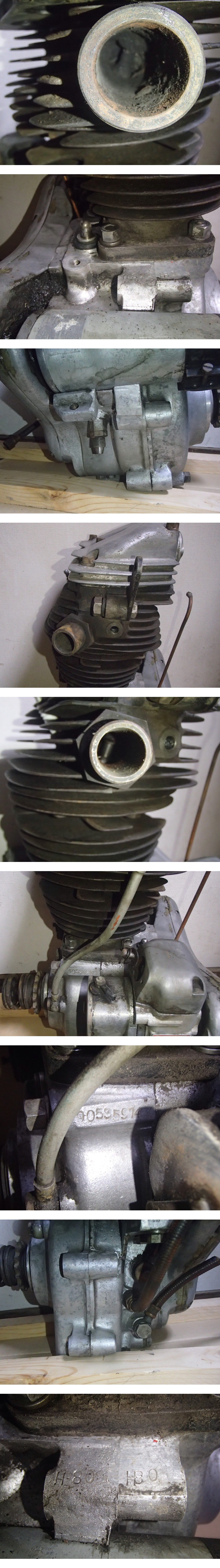 | ★商品説明★ | 【注意】商品説明欄を最後までよくご覧いただき、ご納得頂いてご入札頂けますようよろしくお願いいたします。また、商品詳細に追加写真がありますが、スマホでは表示されない可能性があります。必ずパソコンにてご確認よろしくお願いいたします。【注意】 目黒製作所製のバイク『メグロジュニア S3』に使用されていたエンジンです。 写真に写っている物の出品です。写真の他に付属品はありません。 とある農家さんの納屋に車体から取り外された状態で保管されていた品です。 屋内保管でしたがかなり汚れた状態だったので、当方で灯油及びパーツクリーナーで洗浄、脱脂を行いました。 大まかな部分の汚れは取れたので、60年以上経過した物の割りには綺麗な状態かとは思います。 ただ、分解洗浄は行っていないので、シリンダーの溝奥や細部内部に汚れが残っている可能性が高いです。 また、実際に動作確認は行えておりません。 あくまでもジャンク扱いの現状品としてお考えください。 全体的に傷や軽めの凹みはありますが、致命的なダメージは無いかと思います。 Y字カバー溝にシリコン付着があるので、一度開けられている可能性があります。 繋がっているワイヤーホースの一本は切れかけています。 目視の限りですがボルトやナット、ビス部に目立つ錆や山潰れは無いようです。 シリンダー側はそれなりに錆がありますが、クランクケース側(下側)は致命的な錆は見受けられません。 ただ、当方知識が無い為あくまでも素人目視となります。写真をよくご確認の上、ご検討ください。 非常に重量があるため(30kg以上)発送方法は佐川急便ラージサイズ宅配便のみとなります。サイズは180サイズです。 送料は下記の発送詳細記載のリンクよりご確認ください。 通常発送の他、直接引き取りも可能です。ご希望の方は落札後に取引メッセージにてご連絡ください。商品保管場所は神奈川県横浜市泉区です。 商品の性質上、同梱発送はお受けできません。あらかじめご了承ください。 ただ、同時出品中のガソリンタンクやギアボックスと合わせて直接引き取りは可能です。こちらもご希望の方は落札後に取引メッセージにてご連絡ください。 どうぞよろしくお願いいたします。 |
