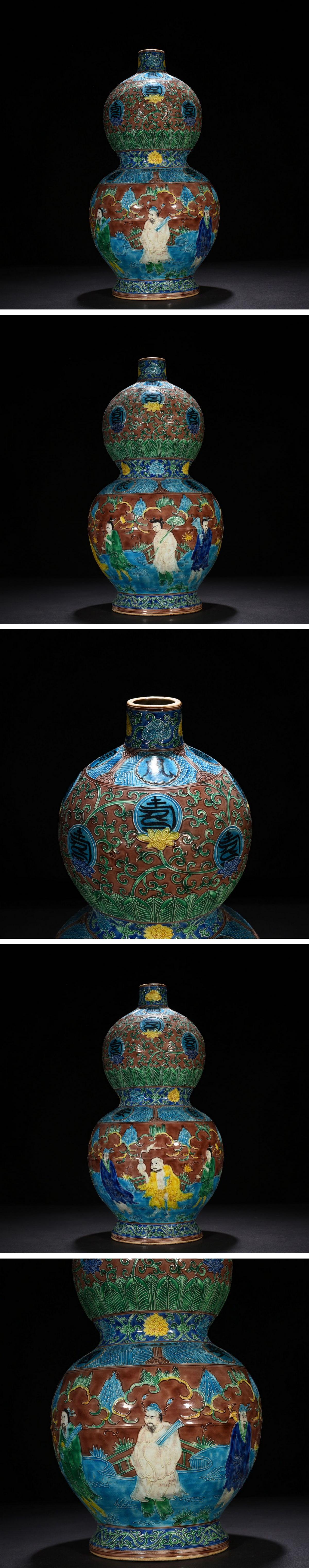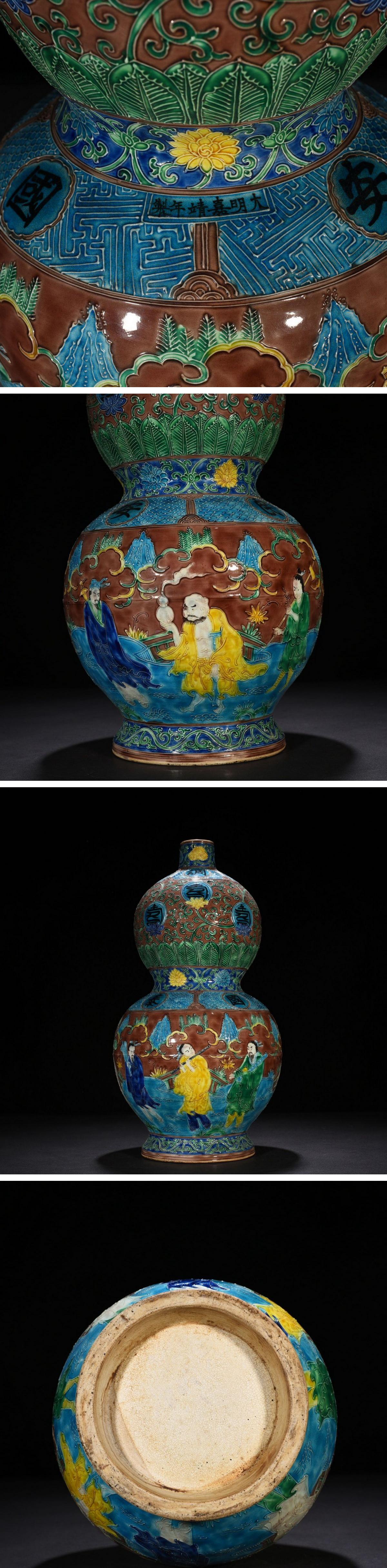 【清】関西某オークション購入 中国伝来 明時代物 大明嘉靖年製 琺華彩八仙紋瓢箪瓶当時物 時代コレクション8L1-YS