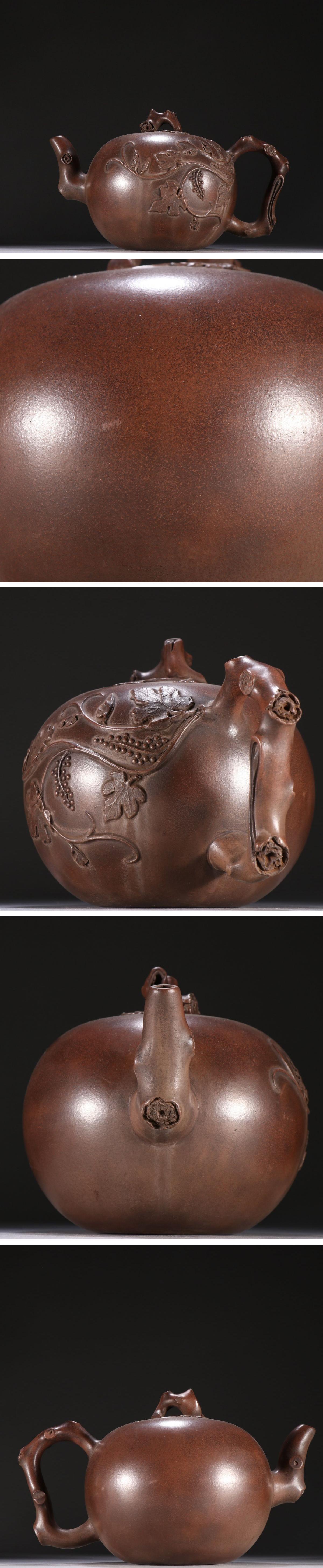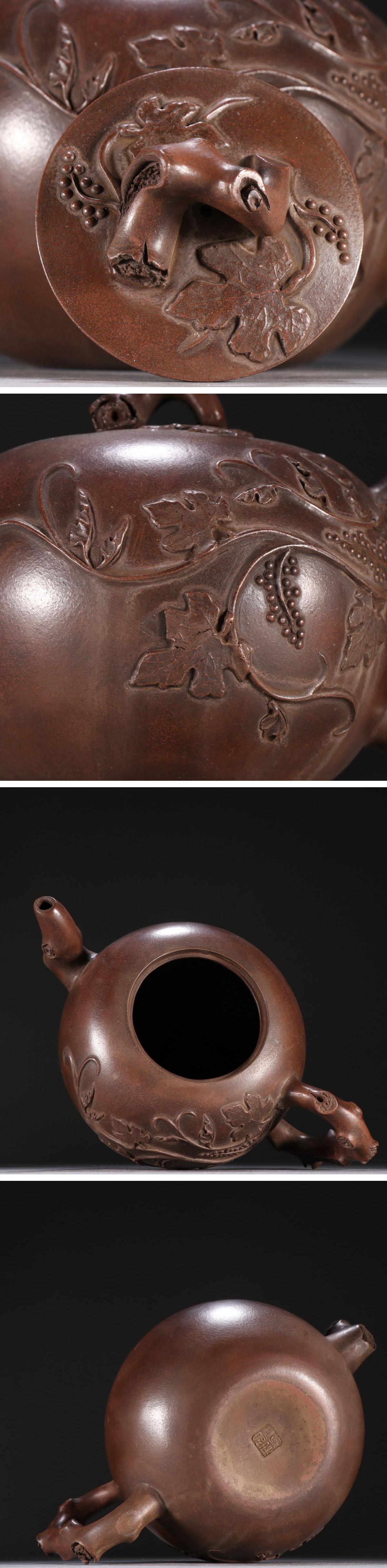 【清】関西某オークション購入 中国伝来 時代物 在銘 蒲萄紋急須 紫砂朱泥 当時物 時代コレクション8L1-AM