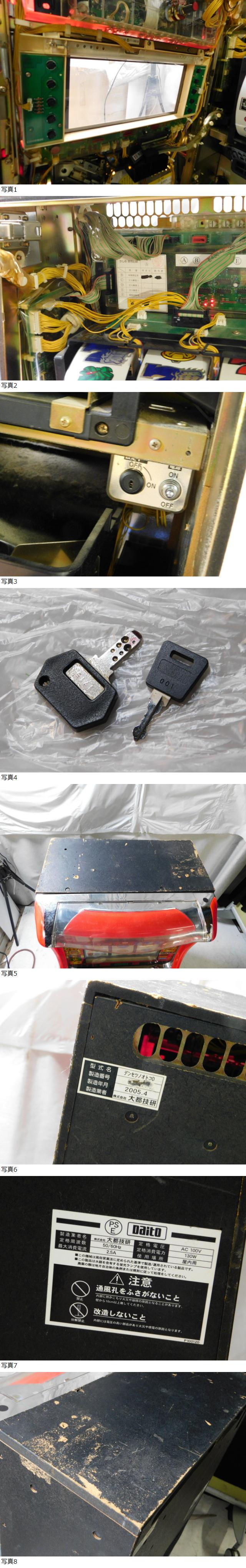 ★記載・・【Daito 押忍!番長】 ★50/60Hz /130W /2.5A 室内用 ★家庭用電源に本体のコンセントを差し、電源がつく事を確認しました。 ★液晶画面にドット抜けがあります。 ★メダル不要機です。 ★設定出来た事を確認しました。 ★ボリューム調整出来た事を確認しました。 ★レバーを引いて回転しボタンを押し止まって遊べた事を確認しました。 ★設定・ドアキーあります。